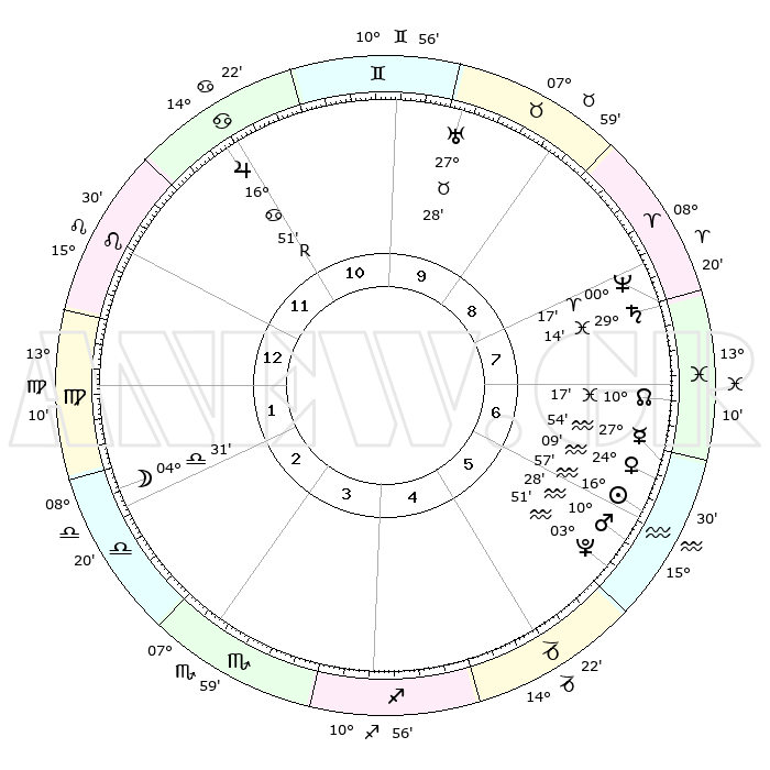 | | ΘΕΣΕΙΣ ΠΛΑΝΗΤΩΝ ΑΣΤΡΟΛΟΓΙΚΟΥ ΧΑΡΤΗ ΤΗΣ ΣΤΙΓΜΗΣ ΑΥΤΗΣ | | | | Πλανήτης | Ζώδιο | Μοίρες | Δεκαήμ. | Σε οίκο | Απόκλιση | | Ακμές των οίκων | | Ηλιος | Υδροχόος | 16°52' | Δεύτερο | 6 | 15 S 47 | | 1ος | 21°42' | Λέων | | Σελήνη | Ζυγός | 03°34' | Πρώτο | 2 | 03 S 25 | | 2ος | 14°41' | Παρθένος | | Ερμής | Υδροχόος | 27°46' | Τρίτο | 7 | 13 S 39 | | 3ος | 12°31' | Ζυγός | | Αφροδίτη | Υδροχόος | 24°03' | Τρίτο | 7 | 14 S 50 | | 4ος | 15°15' | Σκορπιός | | Αρης | Υδροχόος | 10°24' | Δεύτερο | 6 | 18 S 39 | | 5ος | 20°02' | Τοξότης | | Δίας | Καρκίνος | 16°51'R | Δεύτερο | 11 | 22 N 41 | | 6ος | 22°45' | Αιγόκερως | | Κρόνος | Ιχθείς | 29°14' | Τρίτο | 8 | 02 S 18 | | 7ος | 21°42' | Υδροχόος | | Ουρανός | Ταύρος | 27°27' | Τρίτο | 10 | 19 N 24 | | 8ος | 14°41' | Ιχθείς | | Ποσειδώνας | Κριός | 00°17' | Πρώτο | 8 | 01 S 06 | | 9ος | 12°31' | Κριός | | Πλούτωνας | Υδροχόος | 03°51' | Πρώτο | 6 | 23 S 00 | | 10ος | 15°15' | Ταύρος | | Β. Δεσμός | Ιχθείς | 10°17' | Δεύτερο | 7 | 07 S 43 | | 11ος | 20°02' | Δίδυμοι | | Ωροσκόπος | Λέων | 21°42' | Τρίτο | | | 12ος | 22°45' | Καρκίνος | | Μεσουράνημα | Ταύρος | 15°15' | Δεύτερο | | | |