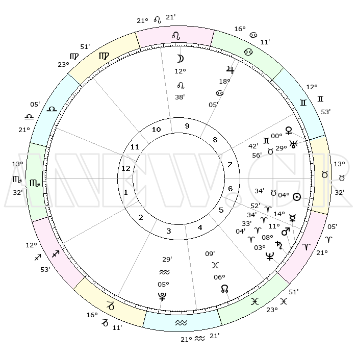 | | ΘΕΣΕΙΣ ΠΛΑΝΗΤΩΝ ΑΣΤΡΟΛΟΓΙΚΟΥ ΧΑΡΤΗ ΤΗΣ ΣΤΙΓΜΗΣ ΑΥΤΗΣ | | | | Πλανήτης | Ζώδιο | Μοίρες | Δεκαήμ. | Σε οίκο | Απόκλιση | | Ακμές των οίκων | | Ηλιος | Ταύρος | 04°31' | Πρώτο | 7 | 13 N 01 | | 1ος | 26°48' | Ζυγός | | Σελήνη | Λέων | 11°51' | Δεύτερο | 10 | 19 N 21 | | 2ος | 25°01' | Σκορπιός | | Ερμής | Κριός | 14°47' | Δεύτερο | 6 | 03 N 34 | | 3ος | 26°44' | Τοξότης | | Αφροδίτη | Δίδυμοι | 00°38' | Πρώτο | 8 | 20 N 53 | | 4ος | 00°43' | Υδροχόος | | Αρης | Κριός | 11°32' | Δεύτερο | 6 | 03 N 42 | | 5ος | 03°40' | Ιχθείς | | Δίας | Καρκίνος | 18°05' | Δεύτερο | 9 | 22 N 36 | | 6ος | 02°36' | Κριός | | Κρόνος | Κριός | 08°32' | Πρώτο | 6 | 01 N 24 | | 7ος | 26°48' | Κριός | | Ουρανός | Ταύρος | 29°56' | Τρίτο | 8 | 19 N 58 | | 8ος | 25°01' | Ταύρος | | Ποσειδώνας | Κριός | 03°03' | Πρώτο | 6 | 00 N 00 | | 9ος | 26°44' | Δίδυμοι | | Πλούτωνας | Υδροχόος | 05°29' | Πρώτο | 4 | 22 S 48 | | 10ος | 00°43' | Λέων | | Β. Δεσμός | Ιχθείς | 06°09' | Πρώτο | 5 | 09 S 15 | | 11ος | 03°40' | Παρθένος | | Ωροσκόπος | Ζυγός | 26°48' | Τρίτο | | | 12ος | 02°36' | Ζυγός | | Μεσουράνημα | Λέων | 00°43' | Πρώτο | | | |