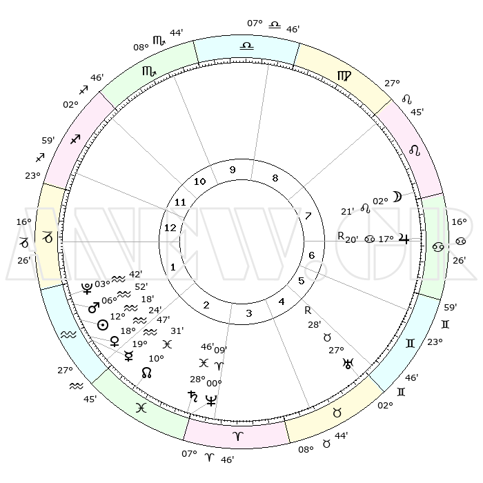 | | ΘΕΣΕΙΣ ΠΛΑΝΗΤΩΝ ΑΣΤΡΟΛΟΓΙΚΟΥ ΧΑΡΤΗ ΤΗΣ ΣΤΙΓΜΗΣ ΑΥΤΗΣ | | | | Πλανήτης | Ζώδιο | Μοίρες | Δεκαήμ. | Σε οίκο | Απόκλιση | | Ακμές των οίκων | | Ηλιος | Υδροχόος | 12°02' | Δεύτερο | 4 | 17 S 11 | | 1ος | 25°31' | Ζυγός | | Σελήνη | Καρκίνος | 28°35' | Τρίτο | 9 | 23 N 46 | | 2ος | 23°40' | Σκορπιός | | Ερμής | Υδροχόος | 19°19' | Δεύτερο | 4 | 16 S 49 | | 3ος | 25°17' | Τοξότης | | Αφροδίτη | Υδροχόος | 18°04' | Δεύτερο | 4 | 16 S 42 | | 4ος | 29°11' | Αιγόκερως | | Αρης | Υδροχόος | 06°40' | Πρώτο | 4 | 19 S 37 | | 5ος | 02°08' | Ιχθείς | | Δίας | Καρκίνος | 17°22'R | Δεύτερο | 9 | 22 N 36 | | 6ος | 01°11' | Κριός | | Κρόνος | Ιχθείς | 28°45' | Τρίτο | 5 | 02 S 30 | | 7ος | 25°31' | Κριός | | Ουρανός | Ταύρος | 27°28'R | Τρίτο | 8 | 19 N 24 | | 8ος | 23°40' | Ταύρος | | Ποσειδώνας | Κριός | 00°08' | Πρώτο | 5 | 01 S 09 | | 9ος | 25°17' | Δίδυμοι | | Πλούτωνας | Υδροχόος | 03°42' | Πρώτο | 4 | 23 S 01 | | 10ος | 29°11' | Καρκίνος | | Β. Δεσμός | Ιχθείς | 10°32' | Δεύτερο | 5 | 07 S 37 | | 11ος | 02°08' | Παρθένος | | Ωροσκόπος | Ζυγός | 25°31' | Τρίτο | | | 12ος | 01°11' | Ζυγός | | Μεσουράνημα | Καρκίνος | 29°11' | Τρίτο | | | |