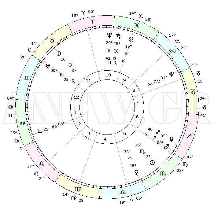 | | ΘΕΣΕΙΣ ΠΛΑΝΗΤΩΝ ΑΣΤΡΟΛΟΓΙΚΟΥ ΧΑΡΤΗ ΤΗΣ ΣΤΙΓΜΗΣ ΑΥΤΗΣ | | | | Πλανήτης | Ζώδιο | Μοίρες | Δεκαήμ. | Σε οίκο | Απόκλιση | | Ακμές των οίκων | | Ηλιος | Σκορπιός | 13°30' | Δεύτερο | 6 | 15 S 53 | | 1ος | 00°31' | Δίδυμοι | | Σελήνη | Ταύρος | 15°11' | Δεύτερο | 12 | 20 N 31 | | 2ος | 25°13' | Δίδυμοι | | Ερμής | Τοξότης | 05°45' | Πρώτο | 7 | 24 S 00 | | 3ος | 16°37' | Καρκίνος | | Αφροδίτη | Ζυγός | 28°25' | Τρίτο | 6 | 09 S 36 | | 4ος | 09°25' | Λέων | | Αρης | Τοξότης | 00°49' | Πρώτο | 7 | 20 S 45 | | 5ος | 07°58' | Παρθένος | | Δίας | Καρκίνος | 25°06' | Τρίτο | 3 | 21 N 12 | | 6ος | 16°30' | Ζυγός | | Κρόνος | Ιχθείς | 25°44'R | Τρίτο | 11 | 03 S 57 | | 7ος | 00°31' | Τοξότης | | Ουρανός | Δίδυμοι | 00°05'R | Πρώτο | 12 | 19 N 58 | | 8ος | 25°13' | Τοξότης | | Ποσειδώνας | Ιχθείς | 29°42'R | Τρίτο | 11 | 01 S 22 | | 9ος | 16°37' | Αιγόκερως | | Πλούτωνας | Υδροχόος | 01°29' | Πρώτο | 9 | 23 S 30 | | 10ος | 09°25' | Υδροχόος | | Β. Δεσμός | Ιχθείς | 15°09' | Δεύτερο | 11 | 05 S 51 | | 11ος | 07°58' | Ιχθείς | | Ωροσκόπος | Δίδυμοι | 00°31' | Πρώτο | | | 12ος | 16°30' | Κριός | | Μεσουράνημα | Υδροχόος | 09°25' | Πρώτο | | | |