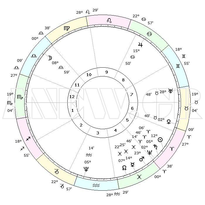 | | ΘΕΣΕΙΣ ΠΛΑΝΗΤΩΝ ΑΣΤΡΟΛΟΓΙΚΟΥ ΧΑΡΤΗ ΤΗΣ ΣΤΙΓΜΗΣ ΑΥΤΗΣ | | | | Πλανήτης | Ζώδιο | Μοίρες | Δεκαήμ. | Σε οίκο | Απόκλιση | | Ακμές των οίκων | | Ηλιος | Κριός | 12°02' | Δεύτερο | 6 | 04 N 45 | | 1ος | 01°46' | Σκορπιός | | Σελήνη | Ζυγός | 08°14' | Πρώτο | 12 | 05 S 37 | | 2ος | 00°17' | Τοξότης | | Ερμής | Ιχθείς | 14°22' | Δεύτερο | 5 | 07 S 28 | | 3ος | 02°23' | Αιγόκερως | | Αφροδίτη | Ταύρος | 02°36' | Πρώτο | 7 | 11 N 59 | | 4ος | 06°42' | Υδροχόος | | Αρης | Ιχθείς | 23°44' | Τρίτο | 5 | 03 S 27 | | 5ος | 09°35' | Ιχθείς | | Δίας | Καρκίνος | 15°50' | Δεύτερο | 9 | 22 N 52 | | 6ος | 08°06' | Κριός | | Κρόνος | Κριός | 05°45' | Πρώτο | 5 | 00 N 20 | | 7ος | 01°46' | Ταύρος | | Ουρανός | Ταύρος | 28°48' | Τρίτο | 7 | 19 N 43 | | 8ος | 00°17' | Δίδυμοι | | Ποσειδώνας | Κριός | 02°14' | Πρώτο | 5 | 00 S 19 | | 9ος | 02°23' | Καρκίνος | | Πλούτωνας | Υδροχόος | 05°14' | Πρώτο | 3 | 22 S 47 | | 10ος | 06°42' | Λέων | | Β. Δεσμός | Ιχθείς | 07°22' | Πρώτο | 4 | 08 S 48 | | 11ος | 09°35' | Παρθένος | | Ωροσκόπος | Σκορπιός | 01°46' | Πρώτο | | | 12ος | 08°06' | Ζυγός | | Μεσουράνημα | Λέων | 06°42' | Πρώτο | | | |
