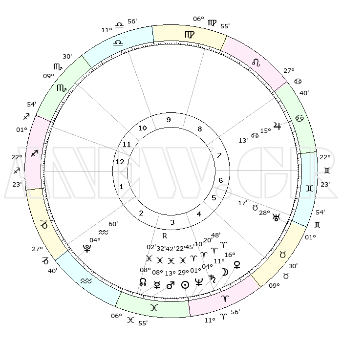 | | ΘΕΣΕΙΣ ΠΛΑΝΗΤΩΝ ΑΣΤΡΟΛΟΓΙΚΟΥ ΧΑΡΤΗ ΤΗΣ ΣΤΙΓΜΗΣ ΑΥΤΗΣ | | | | Πλανήτης | Ζώδιο | Μοίρες | Δεκαήμ. | Σε οίκο | Απόκλιση | | Ακμές των οίκων | | Ηλιος | Ιχθείς | 29°18' | Τρίτο | 4 | 00 S 17 | | 1ος | 29°45' | Σκορπιός | | Σελήνη | Κριός | 10°16' | Δεύτερο | 4 | 06 N 35 | | 2ος | 00°50' | Αιγόκερως | | Ερμής | Ιχθείς | 08°32'R | Πρώτο | 3 | 07 S 15 | | 3ος | 06°30' | Υδροχόος | | Αφροδίτη | Κριός | 16°42' | Δεύτερο | 5 | 05 N 44 | | 4ος | 12°32' | Ιχθείς | | Αρης | Ιχθείς | 13°38' | Δεύτερο | 4 | 07 S 26 | | 5ος | 13°36' | Κριός | | Δίας | Καρκίνος | 15°13' | Δεύτερο | 8 | 22 N 56 | | 6ος | 08°41' | Ταύρος | | Κρόνος | Κριός | 04°09' | Πρώτο | 4 | 00 S 18 | | 7ος | 29°45' | Ταύρος | | Ουρανός | Ταύρος | 28°17' | Τρίτο | 6 | 19 N 36 | | 8ος | 00°50' | Καρκίνος | | Ποσειδώνας | Κριός | 01°45' | Πρώτο | 4 | 00 S 30 | | 9ος | 06°30' | Λέων | | Πλούτωνας | Υδροχόος | 04°60' | Πρώτο | 2 | 22 S 49 | | 10ος | 12°32' | Παρθένος | | Β. Δεσμός | Ιχθείς | 08°03' | Πρώτο | 3 | 08 S 33 | | 11ος | 13°36' | Ζυγός | | Ωροσκόπος | Σκορπιός | 29°45' | Τρίτο | | | 12ος | 08°41' | Σκορπιός | | Μεσουράνημα | Παρθένος | 12°32' | Δεύτερο | | | |