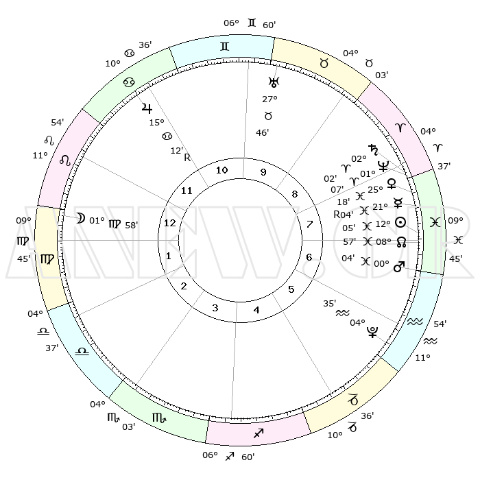 | | ΘΕΣΕΙΣ ΠΛΑΝΗΤΩΝ ΑΣΤΡΟΛΟΓΙΚΟΥ ΧΑΡΤΗ ΤΗΣ ΣΤΙΓΜΗΣ ΑΥΤΗΣ | | | | Πλανήτης | Ζώδιο | Μοίρες | Δεκαήμ. | Σε οίκο | Απόκλιση | | Ακμές των οίκων | | Ηλιος | Ιχθείς | 12°01' | Δεύτερο | 7 | 07 S 03 | | 1ος | 21°58' | Λέων | | Σελήνη | Παρθένος | 01°09' | Πρώτο | 1 | 11 N 44 | | 2ος | 14°58' | Παρθένος | | Ερμής | Ιχθείς | 21°06'R | Τρίτο | 8 | 00 S 18 | | 3ος | 12°50' | Ζυγός | | Αφροδίτη | Ιχθείς | 25°14' | Τρίτο | 8 | 03 S 07 | | 4ος | 15°34' | Σκορπιός | | Αρης | Ιχθείς | 00°01' | Πρώτο | 7 | 12 S 29 | | 5ος | 20°21' | Τοξότης | | Δίας | Καρκίνος | 15°12'R | Δεύτερο | 11 | 22 N 55 | | 6ος | 23°02' | Αιγόκερως | | Κρόνος | Κριός | 02°02' | Πρώτο | 8 | 01 S 09 | | 7ος | 21°58' | Υδροχόος | | Ουρανός | Ταύρος | 27°46' | Τρίτο | 10 | 19 N 29 | | 8ος | 14°58' | Ιχθείς | | Ποσειδώνας | Κριός | 01°06' | Πρώτο | 8 | 00 S 46 | | 9ος | 12°50' | Κριός | | Πλούτωνας | Υδροχόος | 04°35' | Πρώτο | 6 | 22 S 52 | | 10ος | 15°35' | Ταύρος | | Β. Δεσμός | Ιχθείς | 08°58' | Πρώτο | 7 | 08 S 12 | | 11ος | 20°21' | Δίδυμοι | | Ωροσκόπος | Λέων | 21°58' | Τρίτο | | | 12ος | 23°02' | Καρκίνος | | Μεσουράνημα | Ταύρος | 15°35' | Δεύτερο | | | |