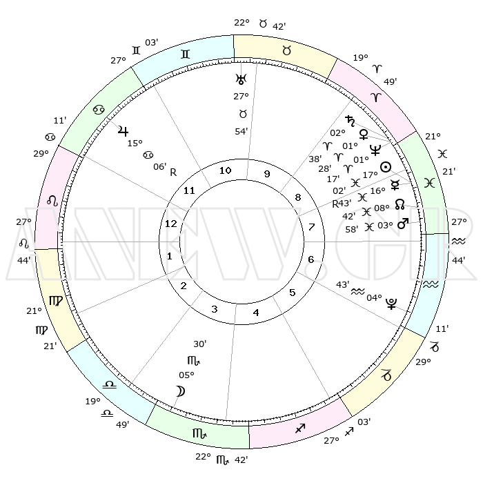 | | ΘΕΣΕΙΣ ΠΛΑΝΗΤΩΝ ΑΣΤΡΟΛΟΓΙΚΟΥ ΧΑΡΤΗ ΤΗΣ ΣΤΙΓΜΗΣ ΑΥΤΗΣ | | | | Πλανήτης | Ζώδιο | Μοίρες | Δεκαήμ. | Σε οίκο | Απόκλιση | | Ακμές των οίκων | | Ηλιος | Ιχθείς | 16°59' | Δεύτερο | 8 | 05 S 08 | | 1ος | 12°03' | Λέων | | Σελήνη | Σκορπιός | 04°50' | Πρώτο | 4 | 17 S 14 | | 2ος | 04°04' | Παρθένος | | Ερμής | Ιχθείς | 16°47'R | Δεύτερο | 8 | 01 S 52 | | 3ος | 00°44' | Ζυγός | | Αφροδίτη | Κριός | 01°24' | Πρώτο | 9 | 00 S 35 | | 4ος | 02°57' | Σκορπιός | | Αρης | Ιχθείς | 03°55' | Πρώτο | 7 | 11 S 05 | | 5ος | 08°26' | Τοξότης | | Δίας | Καρκίνος | 15°06'R | Δεύτερο | 12 | 22 N 56 | | 6ος | 12°18' | Αιγόκερως | | Κρόνος | Κριός | 02°38' | Πρώτο | 9 | 00 S 54 | | 7ος | 12°03' | Υδροχόος | | Ουρανός | Ταύρος | 27°54' | Τρίτο | 10 | 19 N 31 | | 8ος | 04°04' | Ιχθείς | | Ποσειδώνας | Κριός | 01°17' | Πρώτο | 9 | 00 S 41 | | 9ος | 00°44' | Κριός | | Πλούτωνας | Υδροχόος | 04°42' | Πρώτο | 6 | 22 S 51 | | 10ος | 02°57' | Ταύρος | | Β. Δεσμός | Ιχθείς | 08°42' | Πρώτο | 8 | 08 S 18 | | 11ος | 08°26' | Δίδυμοι | | Ωροσκόπος | Λέων | 12°03' | Δεύτερο | | | 12ος | 12°18' | Καρκίνος | | Μεσουράνημα | Ταύρος | 02°57' | Πρώτο | | | |