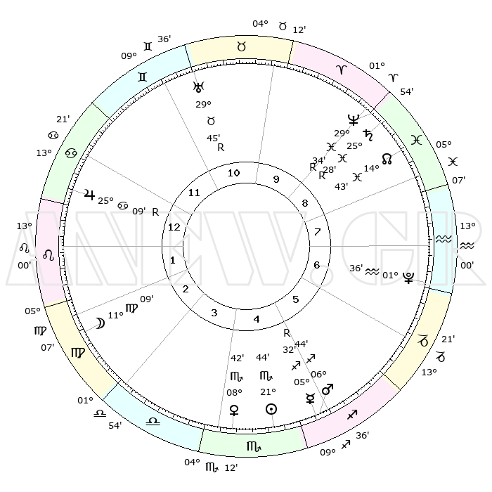 | | ΘΕΣΕΙΣ ΠΛΑΝΗΤΩΝ ΑΣΤΡΟΛΟΓΙΚΟΥ ΧΑΡΤΗ ΤΗΣ ΣΤΙΓΜΗΣ ΑΥΤΗΣ | | | | Πλανήτης | Ζώδιο | Μοίρες | Δεκαήμ. | Σε οίκο | Απόκλιση | | Ακμές των οίκων | | Ηλιος | Σκορπιός | 21°41' | Τρίτο | 5 | 18 S 11 | | 1ος | 25°12' | Καρκίνος | | Σελήνη | Παρθένος | 10°23' | Δεύτερο | 3 | 08 N 09 | | 2ος | 15°57' | Λέων | | Ερμής | Τοξότης | 05°35'R | Πρώτο | 5 | 22 S 45 | | 3ος | 10°21' | Παρθένος | | Αφροδίτη | Σκορπιός | 08°37' | Πρώτο | 4 | 13 S 12 | | 4ος | 10°45' | Ζυγός | | Αρης | Τοξότης | 06°42' | Πρώτο | 5 | 21 S 56 | | 5ος | 16°50' | Σκορπιός | | Δίας | Καρκίνος | 25°09'R | Τρίτο | 12 | 21 N 13 | | 6ος | 23°21' | Τοξότης | | Κρόνος | Ιχθείς | 25°28'R | Τρίτο | 9 | 04 S 02 | | 7ος | 25°12' | Αιγόκερως | | Ουρανός | Ταύρος | 29°46'R | Τρίτο | 11 | 19 N 53 | | 8ος | 15°57' | Υδροχόος | | Ποσειδώνας | Ιχθείς | 29°34'R | Τρίτο | 9 | 01 S 25 | | 9ος | 10°21' | Ιχθείς | | Πλούτωνας | Υδροχόος | 01°36' | Πρώτο | 7 | 23 S 28 | | 10ος | 10°45' | Κριός | | Β. Δεσμός | Ιχθείς | 14°43' | Δεύτερο | 9 | 06 S 01 | | 11ος | 16°50' | Ταύρος | | Ωροσκόπος | Καρκίνος | 25°12' | Τρίτο | | | 12ος | 23°21' | Δίδυμοι | | Μεσουράνημα | Κριός | 10°45' | Δεύτερο | | | |