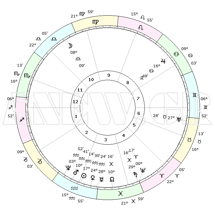 | | ΘΕΣΕΙΣ ΠΛΑΝΗΤΩΝ ΑΣΤΡΟΛΟΓΙΚΟΥ ΧΑΡΤΗ ΤΗΣ ΣΤΙΓΜΗΣ ΑΥΤΗΣ | | | | Πλανήτης | Ζώδιο | Μοίρες | Δεκαήμ. | Σε οίκο | Απόκλιση | | Ακμές των οίκων | | Ηλιος | Υδροχόος | 17°10' | Δεύτερο | 3 | 15 S 41 | | 1ος | 17°12' | Σκορπιός | | Σελήνη | Ζυγός | 07°18' | Πρώτο | 11 | 05 S 11 | | 2ος | 16°53' | Τοξότης | | Ερμής | Υδροχόος | 28°17' | Τρίτο | 4 | 13 S 26 | | 3ος | 20°39' | Αιγόκερως | | Αφροδίτη | Υδροχόος | 24°25' | Τρίτο | 3 | 14 S 43 | | 4ος | 26°05' | Υδροχόος | | Αρης | Υδροχόος | 10°38' | Δεύτερο | 3 | 18 S 35 | | 5ος | 28°21' | Ιχθείς | | Δίας | Καρκίνος | 16°50'R | Δεύτερο | 8 | 22 N 41 | | 6ος | 25°07' | Κριός | | Κρόνος | Ιχθείς | 29°15' | Τρίτο | 5 | 02 S 17 | | 7ος | 17°12' | Ταύρος | | Ουρανός | Ταύρος | 27°28' | Τρίτο | 7 | 19 N 24 | | 8ος | 16°53' | Δίδυμοι | | Ποσειδώνας | Κριός | 00°17' | Πρώτο | 5 | 01 S 05 | | 9ος | 20°39' | Καρκίνος | | Πλούτωνας | Υδροχόος | 03°51' | Πρώτο | 3 | 23 S 00 | | 10ος | 26°05' | Λέων | | Β. Δεσμός | Ιχθείς | 10°16' | Δεύτερο | 4 | 07 S 43 | | 11ος | 28°21' | Παρθένος | | Ωροσκόπος | Σκορπιός | 17°12' | Δεύτερο | | | 12ος | 25°07' | Ζυγός | | Μεσουράνημα | Λέων | 26°05' | Τρίτο | | | |