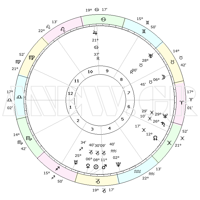 | | ΘΕΣΕΙΣ ΠΛΑΝΗΤΩΝ ΑΣΤΡΟΛΟΓΙΚΟΥ ΧΑΡΤΗ ΤΗΣ ΣΤΙΓΜΗΣ ΑΥΤΗΣ | | | | Πλανήτης | Ζώδιο | Μοίρες | Δεκαήμ. | Σε οίκο | Απόκλιση | | Ακμές των οίκων | | Ηλιος | Αιγόκερως | 08°26' | Πρώτο | 4 | 23 S 10 | | 1ος | 26°10' | Παρθένος | | Σελήνη | Ταύρος | 05°44' | Πρώτο | 8 | 17 N 19 | | 2ος | 22°28' | Ζυγός | | Ερμής | Τοξότης | 25°28' | Τρίτο | 3 | 23 S 41 | | 3ος | 22°44' | Σκορπιός | | Αφροδίτη | Αιγόκερως | 06°34' | Πρώτο | 4 | 23 S 42 | | 4ος | 25°41' | Τοξότης | | Αρης | Αιγόκερως | 11°05' | Δεύτερο | 4 | 23 S 51 | | 5ος | 28°43' | Αιγόκερως | | Δίας | Καρκίνος | 21°38'R | Τρίτο | 10 | 21 N 56 | | 6ος | 29°18' | Υδροχόος | | Κρόνος | Ιχθείς | 26°10' | Τρίτο | 7 | 03 S 36 | | 7ος | 26°10' | Ιχθείς | | Ουρανός | Ταύρος | 28°00'R | Τρίτο | 9 | 19 N 31 | | 8ος | 22°28' | Κριός | | Ποσειδώνας | Ιχθείς | 29°29' | Τρίτο | 7 | 01 S 26 | | 9ος | 22°44' | Ταύρος | | Πλούτωνας | Υδροχόος | 02°40' | Πρώτο | 5 | 23 S 14 | | 10ος | 25°41' | Δίδυμοι | | Β. Δεσμός | Ιχθείς | 12°17' | Δεύτερο | 6 | 06 S 57 | | 11ος | 28°43' | Καρκίνος | | Ωροσκόπος | Παρθένος | 26°10' | Τρίτο | | | 12ος | 29°18' | Λέων | | Μεσουράνημα | Δίδυμοι | 25°41' | Τρίτο | | | |
