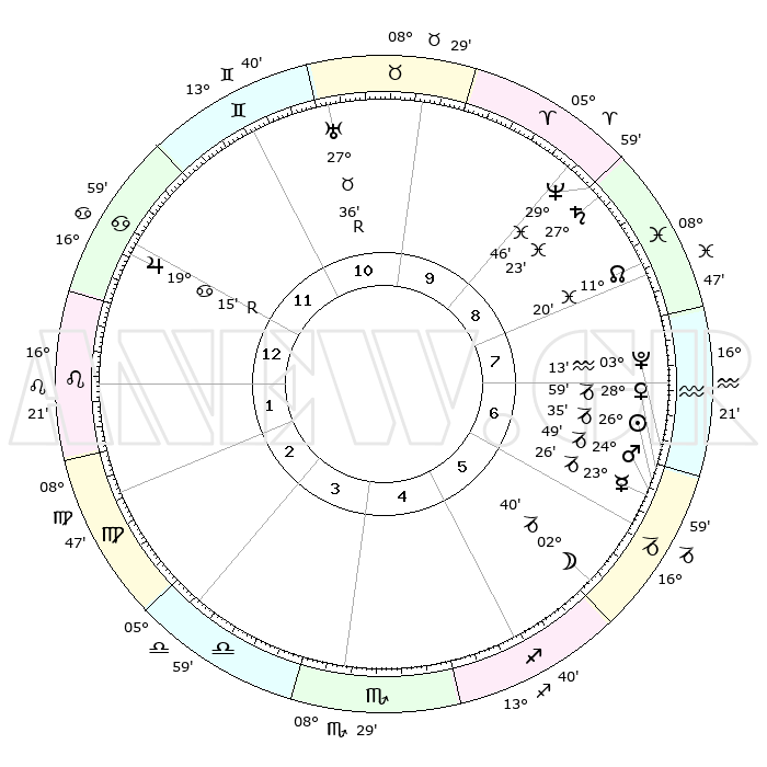 | | ΘΕΣΕΙΣ ΠΛΑΝΗΤΩΝ ΑΣΤΡΟΛΟΓΙΚΟΥ ΧΑΡΤΗ ΤΗΣ ΣΤΙΓΜΗΣ ΑΥΤΗΣ | | | | Πλανήτης | Ζώδιο | Μοίρες | Δεκαήμ. | Σε οίκο | Απόκλιση | | Ακμές των οίκων | | Ηλιος | Αιγόκερως | 26°30' | Τρίτο | 7 | 20 S 51 | | 1ος | 23°04' | Καρκίνος | | Σελήνη | Αιγόκερως | 01°42' | Πρώτο | 6 | 28 S 11 | | 2ος | 13°43' | Λέων | | Ερμής | Αιγόκερως | 23°18' | Τρίτο | 7 | 23 S 16 | | 3ος | 07°51' | Παρθένος | | Αφροδίτη | Αιγόκερως | 28°53' | Τρίτο | 7 | 21 S 23 | | 4ος | 07°56' | Ζυγός | | Αρης | Αιγόκερως | 24°45' | Τρίτο | 7 | 22 S 08 | | 5ος | 13°60' | Σκορπιός | | Δίας | Καρκίνος | 19°16'R | Δεύτερο | 12 | 22 N 19 | | 6ος | 20°52' | Τοξότης | | Κρόνος | Ιχθείς | 27°23' | Τρίτο | 9 | 03 S 04 | | 7ος | 23°04' | Αιγόκερως | | Ουρανός | Ταύρος | 27°36'R | Τρίτο | 11 | 19 N 26 | | 8ος | 13°43' | Υδροχόος | | Ποσειδώνας | Ιχθείς | 29°46' | Τρίτο | 9 | 01 S 18 | | 9ος | 07°51' | Ιχθείς | | Πλούτωνας | Υδροχόος | 03°13' | Πρώτο | 7 | 23 S 07 | | 10ος | 07°56' | Κριός | | Β. Δεσμός | Ιχθείς | 11°20' | Δεύτερο | 9 | 07 S 19 | | 11ος | 13°60' | Ταύρος | | Ωροσκόπος | Καρκίνος | 23°04' | Τρίτο | | | 12ος | 20°52' | Δίδυμοι | | Μεσουράνημα | Κριός | 07°56' | Πρώτο | | | |