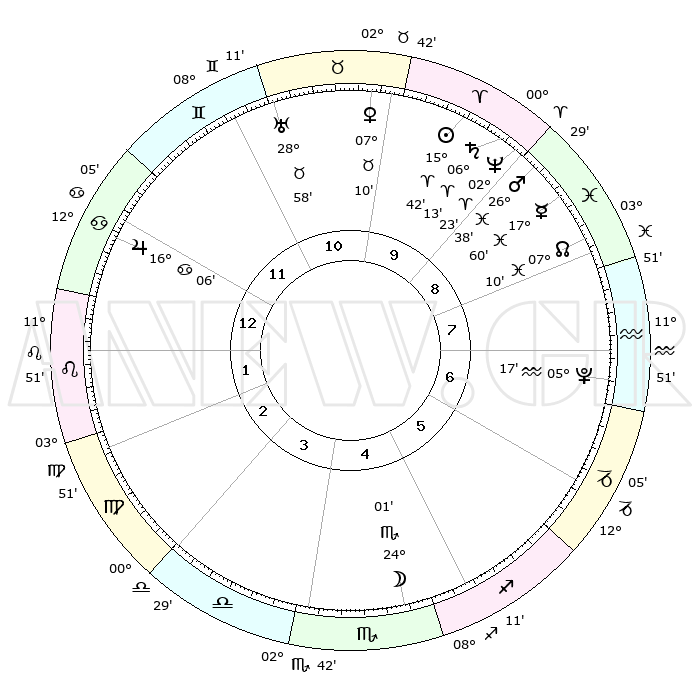 | | ΘΕΣΕΙΣ ΠΛΑΝΗΤΩΝ ΑΣΤΡΟΛΟΓΙΚΟΥ ΧΑΡΤΗ ΤΗΣ ΣΤΙΓΜΗΣ ΑΥΤΗΣ | | | | Πλανήτης | Ζώδιο | Μοίρες | Δεκαήμ. | Σε οίκο | Απόκλιση | | Ακμές των οίκων | | Ηλιος | Κριός | 15°24' | Δεύτερο | 1 | 06 N 04 | | 1ος | 12°30' | Κριός | | Σελήνη | Σκορπιός | 20°15' | Τρίτο | 8 | 22 S 32 | | 2ος | 19°34' | Ταύρος | | Ερμής | Ιχθείς | 17°40' | Δεύτερο | 12 | 06 S 36 | | 3ος | 15°11' | Δίδυμοι | | Αφροδίτη | Ταύρος | 06°47' | Πρώτο | 1 | 13 N 31 | | 4ος | 07°04' | Καρκίνος | | Αρης | Ιχθείς | 26°23' | Τρίτο | 12 | 02 S 23 | | 5ος | 00°03' | Λέων | | Δίας | Καρκίνος | 16°05' | Δεύτερο | 4 | 22 N 50 | | 6ος | 29°30' | Λέων | | Κρόνος | Κριός | 06°11' | Πρώτο | 12 | 00 N 30 | | 7ος | 12°30' | Ζυγός | | Ουρανός | Ταύρος | 28°57' | Τρίτο | 2 | 19 N 45 | | 8ος | 19°34' | Σκορπιός | | Ποσειδώνας | Κριός | 02°22' | Πρώτο | 12 | 00 S 16 | | 9ος | 15°11' | Τοξότης | | Πλούτωνας | Υδροχόος | 05°17' | Πρώτο | 11 | 22 S 47 | | 10ος | 07°04' | Αιγόκερως | | Β. Δεσμός | Ιχθείς | 07°11' | Πρώτο | 12 | 08 S 52 | | 11ος | 00°03' | Υδροχόος | | Ωροσκόπος | Κριός | 12°30' | Δεύτερο | | | 12ος | 29°30' | Υδροχόος | | Μεσουράνημα | Αιγόκερως | 07°04' | Πρώτο | | | |