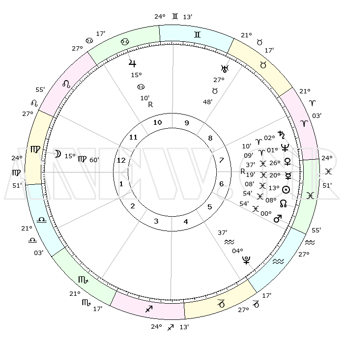 | | ΘΕΣΕΙΣ ΠΛΑΝΗΤΩΝ ΑΣΤΡΟΛΟΓΙΚΟΥ ΧΑΡΤΗ ΤΗΣ ΣΤΙΓΜΗΣ ΑΥΤΗΣ | | | | Πλανήτης | Ζώδιο | Μοίρες | Δεκαήμ. | Σε οίκο | Απόκλιση | | Ακμές των οίκων | | Ηλιος | Ιχθείς | 13°05' | Δεύτερο | 7 | 06 S 39 | | 1ος | 08°19' | Παρθένος | | Σελήνη | Παρθένος | 15°15' | Δεύτερο | 1 | 05 N 17 | | 2ος | 03°02' | Ζυγός | | Ερμής | Ιχθείς | 20°21'R | Τρίτο | 7 | 00 S 30 | | 3ος | 02°22' | Σκορπιός | | Αφροδίτη | Ιχθείς | 26°32' | Τρίτο | 7 | 02 S 35 | | 4ος | 05°19' | Τοξότης | | Αρης | Ιχθείς | 00°51' | Πρώτο | 6 | 12 S 12 | | 5ος | 09°00' | Αιγόκερως | | Δίας | Καρκίνος | 15°11'R | Δεύτερο | 11 | 22 N 55 | | 6ος | 10°23' | Υδροχόος | | Κρόνος | Κριός | 02°09' | Πρώτο | 7 | 01 S 06 | | 7ος | 08°19' | Ιχθείς | | Ουρανός | Ταύρος | 27°48' | Τρίτο | 9 | 19 N 29 | | 8ος | 03°02' | Κριός | | Ποσειδώνας | Κριός | 01°09' | Πρώτο | 7 | 00 S 45 | | 9ος | 02°22' | Ταύρος | | Πλούτωνας | Υδροχόος | 04°36' | Πρώτο | 5 | 22 S 52 | | 10ος | 05°19' | Δίδυμοι | | Β. Δεσμός | Ιχθείς | 08°54' | Πρώτο | 7 | 08 S 14 | | 11ος | 09°00' | Καρκίνος | | Ωροσκόπος | Παρθένος | 08°19' | Πρώτο | | | 12ος | 10°23' | Λέων | | Μεσουράνημα | Δίδυμοι | 05°19' | Πρώτο | | | |