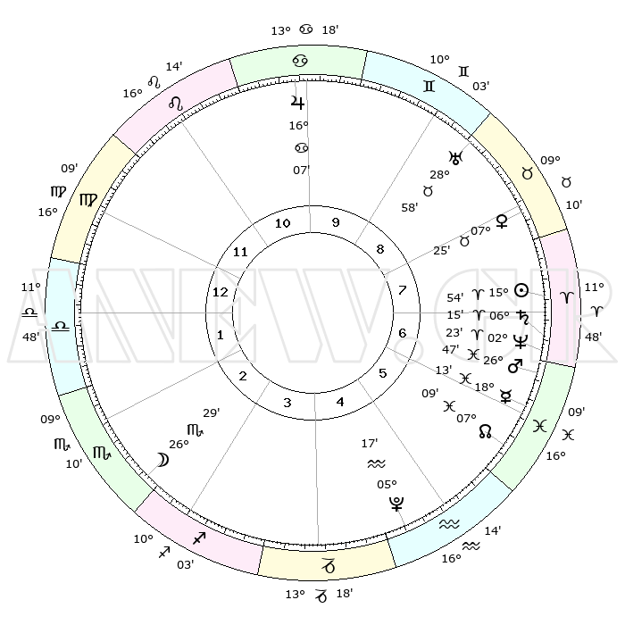 | | ΘΕΣΕΙΣ ΠΛΑΝΗΤΩΝ ΑΣΤΡΟΛΟΓΙΚΟΥ ΧΑΡΤΗ ΤΗΣ ΣΤΙΓΜΗΣ ΑΥΤΗΣ | | | | Πλανήτης | Ζώδιο | Μοίρες | Δεκαήμ. | Σε οίκο | Απόκλιση | | Ακμές των οίκων | | Ηλιος | Κριός | 15°45' | Δεύτερο | 8 | 06 N 12 | | 1ος | 28°21' | Λέων | | Σελήνη | Σκορπιός | 24°42' | Τρίτο | 4 | 23 S 48 | | 2ος | 22°02' | Παρθένος | | Ερμής | Ιχθείς | 18°03' | Δεύτερο | 7 | 06 S 29 | | 3ος | 20°33' | Ζυγός | | Αφροδίτη | Ταύρος | 07°14' | Πρώτο | 9 | 13 N 41 | | 4ος | 23°26' | Σκορπιός | | Αρης | Ιχθείς | 26°40' | Τρίτο | 8 | 02 S 16 | | 5ος | 27°45' | Τοξότης | | Δίας | Καρκίνος | 16°06' | Δεύτερο | 11 | 22 N 50 | | 6ος | 29°50' | Αιγόκερως | | Κρόνος | Κριός | 06°14' | Πρώτο | 8 | 00 N 31 | | 7ος | 28°21' | Υδροχόος | | Ουρανός | Ταύρος | 28°58' | Τρίτο | 10 | 19 N 45 | | 8ος | 22°02' | Ιχθείς | | Ποσειδώνας | Κριός | 02°23' | Πρώτο | 8 | 00 S 15 | | 9ος | 20°33' | Κριός | | Πλούτωνας | Υδροχόος | 05°17' | Πρώτο | 6 | 22 S 47 | | 10ος | 23°26' | Ταύρος | | Β. Δεσμός | Ιχθείς | 07°10' | Πρώτο | 7 | 08 S 53 | | 11ος | 27°45' | Δίδυμοι | | Ωροσκόπος | Λέων | 28°21' | Τρίτο | | | 12ος | 29°50' | Καρκίνος | | Μεσουράνημα | Ταύρος | 23°26' | Τρίτο | | | |
