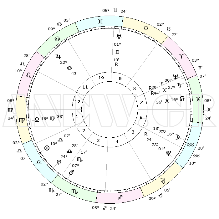 | ΘΕΣΕΙΣ ΠΛΑΝΗΤΩΝ ΑΣΤΡΟΛΟΓΙΚΟΥ ΧΑΡΤΗ ΤΗΣ ΣΤΙΓΜΗΣ ΑΥΤΗΣ | | Πλανήτης | Ζώδιο | Μοίρες | Δεκαήμ. | Σε οίκο | Απόκλιση | | Ακμές των οίκων | Ηλιος | Ζυγός | 10°03' | Δεύτερο | 3 | 03 S 59 | | 1ος | 17°48' | Λέων | Σελήνη | Υδροχόος | 15°22' | Δεύτερο | 6 | 18 S 57 | | 2ος | 10°23' | Παρθένος | Ερμής | Ζυγός | 24°21' | Τρίτο | 3 | 09 S 45 | | 3ος | 07°46' | Ζυγός | Αφροδίτη | Παρθένος | 16°33' | Δεύτερο | 2 | 06 N 32 | | 4ος | 10°20' | Σκορπιός | Αρης | Σκορπιός | 07°14' | Πρώτο | 3 | 14 S 01 | | 5ος | 15°24' | Τοξότης | Δίας | Καρκίνος | 22°42' | Τρίτο | 12 | 21 N 33 | | 6ος | 18°33' | Αιγόκερως | Κρόνος | Ιχθείς | 27°44'R | Τρίτο | 8 | 03 S 12 | | 7ος | 17°48' | Υδροχόος | Ουρανός | Δίδυμοι | 01°10'R | Πρώτο | 10 | 20 N 11 | | 8ος | 10°23' | Ιχθείς | Ποσειδώνας | Κριός | 00°30'R | Πρώτο | 8 | 01 S 04 | | 9ος | 07°46' | Κριός | Πλούτωνας | Υδροχόος | 01°24'R | Πρώτο | 6 | 23 S 32 | | 10ος | 10°20' | Ταύρος | Β. Δεσμός | Ιχθείς | 16°56' | Δεύτερο | 8 | 05 S 09 | | 11ος | 15°24' | Δίδυμοι | Ωροσκόπος | Λέων | 17°48' | Δεύτερο | | | 12ος | 18°33' | Καρκίνος | Μεσουράνημα | Ταύρος | 10°20' | Δεύτερο | | | |