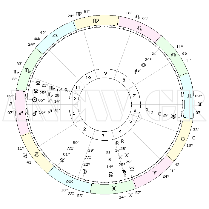 | | ΘΕΣΕΙΣ ΠΛΑΝΗΤΩΝ ΑΣΤΡΟΛΟΓΙΚΟΥ ΧΑΡΤΗ ΤΗΣ ΣΤΙΓΜΗΣ ΑΥΤΗΣ | | | | Πλανήτης | Ζώδιο | Μοίρες | Δεκαήμ. | Σε οίκο | Απόκλιση | | Ακμές των οίκων | | Ηλιος | Τοξότης | 05°11' | Πρώτο | 1 | 21 S 10 | | 1ος | 27°39' | Σκορπιός | | Σελήνη | Υδροχόος | 22°09' | Τρίτο | 3 | 15 S 56 | | 2ος | 28°28' | Τοξότης | | Ερμής | Σκορπιός | 21°18'R | Τρίτο | 12 | 15 S 53 | | 3ος | 03°48' | Υδροχόος | | Αφροδίτη | Σκορπιός | 25°26' | Τρίτο | 12 | 18 S 18 | | 4ος | 09°46' | Ιχθείς | | Αρης | Τοξότης | 16°30' | Δεύτερο | 1 | 23 S 23 | | 5ος | 11°05' | Κριός | | Δίας | Καρκίνος | 24°45'R | Τρίτο | 8 | 21 N 19 | | 6ος | 06°27' | Ταύρος | | Κρόνος | Ιχθείς | 25°17'R | Τρίτο | 4 | 04 S 04 | | 7ος | 27°39' | Ταύρος | | Ουρανός | Ταύρος | 29°12'R | Τρίτο | 7 | 19 N 46 | | 8ος | 28°28' | Δίδυμοι | | Ποσειδώνας | Ιχθείς | 29°25'R | Τρίτο | 4 | 01 S 28 | | 9ος | 03°48' | Λέων | | Πλούτωνας | Υδροχόος | 01°50' | Πρώτο | 2 | 23 S 25 | | 10ος | 09°46' | Παρθένος | | Β. Δεσμός | Ιχθείς | 14°01' | Δεύτερο | 4 | 06 S 17 | | 11ος | 11°05' | Ζυγός | | Ωροσκόπος | Σκορπιός | 27°39' | Τρίτο | | | 12ος | 06°27' | Σκορπιός | | Μεσουράνημα | Παρθένος | 09°46' | Πρώτο | | | |