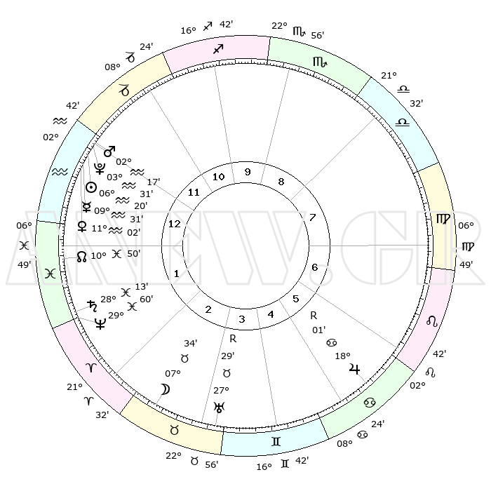| | ΘΕΣΕΙΣ ΠΛΑΝΗΤΩΝ ΑΣΤΡΟΛΟΓΙΚΟΥ ΧΑΡΤΗ ΤΗΣ ΣΤΙΓΜΗΣ ΑΥΤΗΣ | | | | Πλανήτης | Ζώδιο | Μοίρες | Δεκαήμ. | Σε οίκο | Απόκλιση | | Ακμές των οίκων | | Ηλιος | Υδροχόος | 06°16' | Πρώτο | 1 | 18 S 42 | | 1ος | 03°11' | Υδροχόος | | Σελήνη | Ταύρος | 06°37' | Πρώτο | 3 | 17 N 51 | | 2ος | 17°46' | Ιχθείς | | Ερμής | Υδροχόος | 09°24' | Πρώτο | 1 | 19 S 54 | | 3ος | 25°42' | Κριός | | Αφροδίτη | Υδροχόος | 10°56' | Δεύτερο | 1 | 18 S 42 | | 4ος | 23°37' | Ταύρος | | Αρης | Υδροχόος | 02°14' | Πρώτο | 12 | 20 S 39 | | 5ος | 16°10' | Δίδυμοι | | Δίας | Καρκίνος | 18°02'R | Δεύτερο | 6 | 22 N 31 | | 6ος | 07°42' | Καρκίνος | | Κρόνος | Ιχθείς | 28°12' | Τρίτο | 2 | 02 S 43 | | 7ος | 03°11' | Λέων | | Ουρανός | Ταύρος | 27°29'R | Τρίτο | 4 | 19 N 25 | | 8ος | 17°46' | Παρθένος | | Ποσειδώνας | Ιχθείς | 29°59' | Τρίτο | 2 | 01 S 13 | | 9ος | 25°42' | Ζυγός | | Πλούτωνας | Υδροχόος | 03°31' | Πρώτο | 1 | 23 S 03 | | 10ος | 23°37' | Σκορπιός | | Β. Δεσμός | Ιχθείς | 10°50' | Δεύτερο | 1 | 07 S 30 | | 11ος | 16°10' | Τοξότης | | Ωροσκόπος | Υδροχόος | 03°11' | Πρώτο | | | 12ος | 07°42' | Αιγόκερως | | Μεσουράνημα | Σκορπιός | 23°37' | Τρίτο | | | |