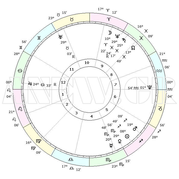 | | ΘΕΣΕΙΣ ΠΛΑΝΗΤΩΝ ΑΣΤΡΟΛΟΓΙΚΟΥ ΧΑΡΤΗ ΤΗΣ ΣΤΙΓΜΗΣ ΑΥΤΗΣ | | | | Πλανήτης | Ζώδιο | Μοίρες | Δεκαήμ. | Σε οίκο | Απόκλιση | | Ακμές των οίκων | | Ηλιος | Τοξότης | 08°47' | Πρώτο | 5 | 21 S 46 | | 1ος | 21°02' | Καρκίνος | | Σελήνη | Κριός | 09°56' | Πρώτο | 10 | 05 N 56 | | 2ος | 11°37' | Λέων | | Ερμής | Σκορπιός | 20°48' | Τρίτο | 5 | 15 S 27 | | 3ος | 05°29' | Παρθένος | | Αφροδίτη | Σκορπιός | 29°54' | Τρίτο | 5 | 19 S 26 | | 4ος | 05°15' | Ζυγός | | Αρης | Τοξότης | 19°07' | Δεύτερο | 6 | 23 S 39 | | 5ος | 11°17' | Σκορπιός | | Δίας | Καρκίνος | 24°33'R | Τρίτο | 1 | 21 N 22 | | 6ος | 18°30' | Τοξότης | | Κρόνος | Ιχθείς | 25°17' | Τρίτο | 9 | 04 S 03 | | 7ος | 21°02' | Αιγόκερως | | Ουρανός | Ταύρος | 29°03'R | Τρίτο | 11 | 19 N 45 | | 8ος | 11°37' | Υδροχόος | | Ποσειδώνας | Ιχθείς | 29°24'R | Τρίτο | 9 | 01 S 29 | | 9ος | 05°29' | Ιχθείς | | Πλούτωνας | Υδροχόος | 01°54' | Πρώτο | 7 | 23 S 24 | | 10ος | 05°15' | Κριός | | Β. Δεσμός | Ιχθείς | 13°49' | Δεύτερο | 9 | 06 S 22 | | 11ος | 11°17' | Ταύρος | | Ωροσκόπος | Καρκίνος | 21°02' | Τρίτο | | | 12ος | 18°30' | Δίδυμοι | | Μεσουράνημα | Κριός | 05°15' | Πρώτο | | | |