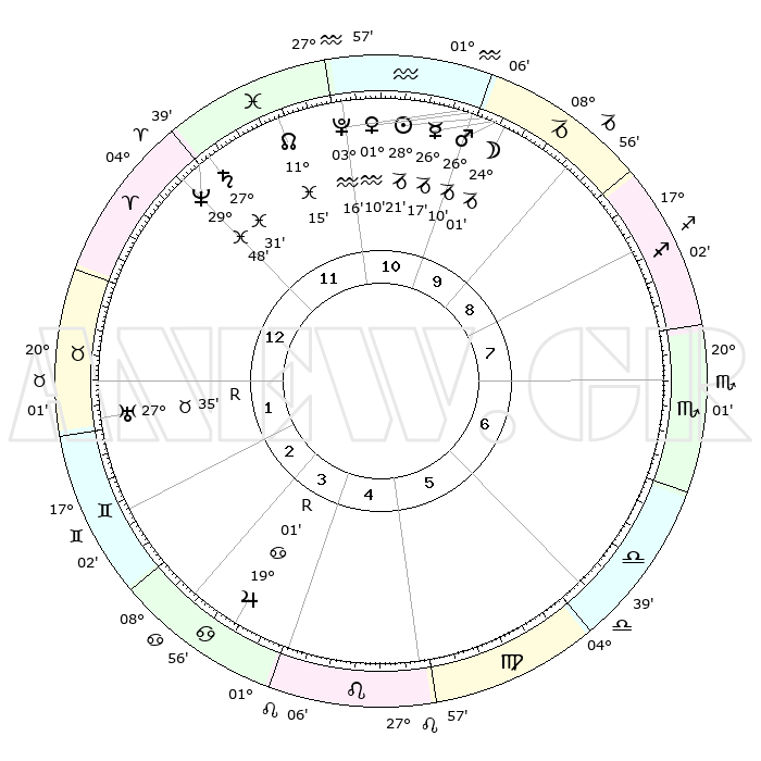 | | ΘΕΣΕΙΣ ΠΛΑΝΗΤΩΝ ΑΣΤΡΟΛΟΓΙΚΟΥ ΧΑΡΤΗ ΤΗΣ ΣΤΙΓΜΗΣ ΑΥΤΗΣ | | | | Πλανήτης | Ζώδιο | Μοίρες | Δεκαήμ. | Σε οίκο | Απόκλιση | | Ακμές των οίκων | | Ηλιος | Αιγόκερως | 28°17' | Τρίτο | 10 | 20 S 30 | | 1ος | 12°36' | Κριός | | Σελήνη | Αιγόκερως | 23°08' | Τρίτο | 10 | 25 S 08 | | 2ος | 19°39' | Ταύρος | | Ερμής | Αιγόκερως | 26°10' | Τρίτο | 10 | 22 S 50 | | 3ος | 15°15' | Δίδυμοι | | Αφροδίτη | Υδροχόος | 01°05' | Πρώτο | 11 | 20 S 58 | | 4ος | 07°07' | Καρκίνος | | Αρης | Αιγόκερως | 26°07' | Τρίτο | 10 | 21 S 53 | | 5ος | 00°06' | Λέων | | Δίας | Καρκίνος | 19°02'R | Δεύτερο | 4 | 22 N 21 | | 6ος | 29°34' | Λέων | | Κρόνος | Ιχθείς | 27°31' | Τρίτο | 12 | 03 S 01 | | 7ος | 12°36' | Ζυγός | | Ουρανός | Ταύρος | 27°35'R | Τρίτο | 2 | 19 N 26 | | 8ος | 19°39' | Σκορπιός | | Ποσειδώνας | Ιχθείς | 29°48' | Τρίτο | 12 | 01 S 17 | | 9ος | 15°15' | Τοξότης | | Πλούτωνας | Υδροχόος | 03°16' | Πρώτο | 11 | 23 S 06 | | 10ος | 07°07' | Αιγόκερως | | Β. Δεσμός | Ιχθείς | 11°15' | Δεύτερο | 12 | 07 S 21 | | 11ος | 00°06' | Υδροχόος | | Ωροσκόπος | Κριός | 12°36' | Δεύτερο | | | 12ος | 29°34' | Υδροχόος | | Μεσουράνημα | Αιγόκερως | 07°07' | Πρώτο | | | |
