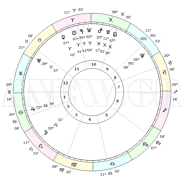 | | ΘΕΣΕΙΣ ΠΛΑΝΗΤΩΝ ΑΣΤΡΟΛΟΓΙΚΟΥ ΧΑΡΤΗ ΤΗΣ ΣΤΙΓΜΗΣ ΑΥΤΗΣ | | | | Πλανήτης | Ζώδιο | Μοίρες | Δεκαήμ. | Σε οίκο | Απόκλιση | | Ακμές των οίκων | | Ηλιος | Κριός | 07°37' | Πρώτο | 11 | 03 N 01 | | 1ος | 04°04' | Δίδυμοι | | Σελήνη | Λέων | 09°35' | Πρώτο | 3 | 20 N 18 | | 2ος | 28°05' | Δίδυμοι | | Ερμής | Ιχθείς | 10°58' | Δεύτερο | 10 | 08 S 04 | | 3ος | 19°23' | Καρκίνος | | Αφροδίτη | Κριός | 27°05' | Τρίτο | 12 | 09 N 53 | | 4ος | 12°28' | Λέων | | Αρης | Ιχθείς | 20°14' | Τρίτο | 11 | 04 S 51 | | 5ος | 11°39' | Παρθένος | | Δίας | Καρκίνος | 15°34' | Δεύτερο | 2 | 22 N 54 | | 6ος | 20°41' | Ζυγός | | Κρόνος | Κριός | 05°12' | Πρώτο | 11 | 00 N 07 | | 7ος | 04°04' | Τοξότης | | Ουρανός | Ταύρος | 28°36' | Τρίτο | 12 | 19 N 41 | | 8ος | 28°05' | Τοξότης | | Ποσειδώνας | Κριός | 02°04' | Πρώτο | 11 | 00 S 23 | | 9ος | 19°23' | Αιγόκερως | | Πλούτωνας | Υδροχόος | 05°09' | Πρώτο | 9 | 22 S 48 | | 10ος | 12°28' | Υδροχόος | | Β. Δεσμός | Ιχθείς | 07°36' | Πρώτο | 10 | 08 S 43 | | 11ος | 11°39' | Ιχθείς | | Ωροσκόπος | Δίδυμοι | 04°04' | Πρώτο | | | 12ος | 20°41' | Κριός | | Μεσουράνημα | Υδροχόος | 12°28' | Δεύτερο | | | |
