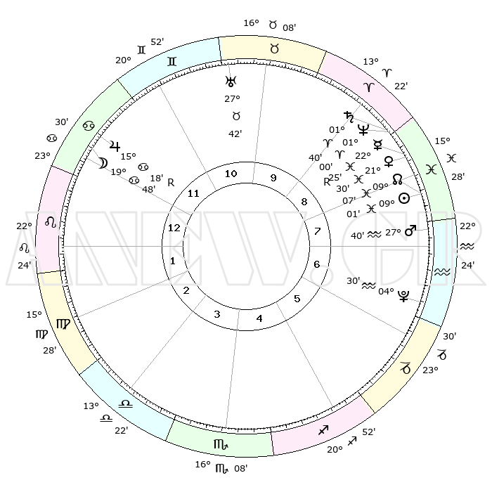 | | ΘΕΣΕΙΣ ΠΛΑΝΗΤΩΝ ΑΣΤΡΟΛΟΓΙΚΟΥ ΧΑΡΤΗ ΤΗΣ ΣΤΙΓΜΗΣ ΑΥΤΗΣ | | | | Πλανήτης | Ζώδιο | Μοίρες | Δεκαήμ. | Σε οίκο | Απόκλιση | | Ακμές των οίκων | | Ηλιος | Ιχθείς | 08°57' | Πρώτο | 8 | 08 S 13 | | 1ος | 02°04' | Λέων | | Σελήνη | Καρκίνος | 18°49' | Δεύτερο | 12 | 26 N 08 | | 2ος | 23°15' | Λέων | | Ερμής | Ιχθείς | 22°26'R | Τρίτο | 9 | 00 S 12 | | 3ος | 18°35' | Παρθένος | | Αφροδίτη | Ιχθείς | 21°25' | Τρίτο | 9 | 04 S 40 | | 4ος | 19°52' | Ζυγός | | Αρης | Υδροχόος | 27°37' | Τρίτο | 8 | 13 S 20 | | 5ος | 25°51' | Σκορπιός | | Δίας | Καρκίνος | 15°18'R | Δεύτερο | 12 | 22 N 54 | | 6ος | 01°13' | Αιγόκερως | | Κρόνος | Κριός | 01°40' | Πρώτο | 9 | 01 S 18 | | 7ος | 02°04' | Υδροχόος | | Ουρανός | Ταύρος | 27°42' | Τρίτο | 11 | 19 N 28 | | 8ος | 23°15' | Υδροχόος | | Ποσειδώνας | Κριός | 00°60' | Πρώτο | 9 | 00 S 48 | | 9ος | 18°35' | Ιχθείς | | Πλούτωνας | Υδροχόος | 04°30' | Πρώτο | 7 | 22 S 53 | | 10ος | 19°52' | Κριός | | Β. Δεσμός | Ιχθείς | 09°07' | Πρώτο | 8 | 08 S 09 | | 11ος | 25°51' | Ταύρος | | Ωροσκόπος | Λέων | 02°04' | Πρώτο | | | 12ος | 01°13' | Καρκίνος | | Μεσουράνημα | Κριός | 19°52' | Δεύτερο | | | |