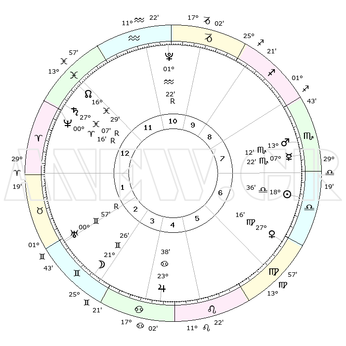 | ΘΕΣΕΙΣ ΠΛΑΝΗΤΩΝ ΑΣΤΡΟΛΟΓΙΚΟΥ ΧΑΡΤΗ ΤΗΣ ΣΤΙΓΜΗΣ ΑΥΤΗΣ | | Πλανήτης | Ζώδιο | Μοίρες | Δεκαήμ. | Σε οίκο | Απόκλιση | | Ακμές των οίκων | Ηλιος | Ζυγός | 18°28' | Δεύτερο | 8 | 07 S 14 | | 1ος | 08°53' | Υδροχόος | Σελήνη | Δίδυμοι | 19°19' | Δεύτερο | 4 | 28 N 12 | | 2ος | 24°09' | Ιχθείς | Ερμής | Σκορπιός | 07°09' | Πρώτο | 9 | 15 S 10 | | 3ος | 01°03' | Ταύρος | Αφροδίτη | Παρθένος | 27°05' | Τρίτο | 8 | 02 N 31 | | 4ος | 28°05' | Ταύρος | Αρης | Σκορπιός | 13°06' | Δεύτερο | 9 | 15 S 57 | | 5ος | 20°18' | Δίδυμοι | Δίας | Καρκίνος | 23°37' | Τρίτο | 6 | 21 N 25 | | 6ος | 12°08' | Καρκίνος | Κρόνος | Ιχθείς | 27°07'R | Τρίτο | 2 | 03 S 27 | | 7ος | 08°53' | Λέων | Ουρανός | Δίδυμοι | 00°57'R | Πρώτο | 4 | 20 N 08 | | 8ος | 24°09' | Παρθένος | Ποσειδώνας | Κριός | 00°16'R | Πρώτο | 2 | 01 S 09 | | 9ος | 01°03' | Σκορπιός | Πλούτωνας | Υδροχόος | 01°22'R | Πρώτο | 12 | 23 S 32 | | 10ος | 28°05' | Σκορπιός | Β. Δεσμός | Ιχθείς | 16°29' | Δεύτερο | 1 | 05 S 20 | | 11ος | 20°18' | Τοξότης | Ωροσκόπος | Υδροχόος | 08°53' | Πρώτο | | | 12ος | 12°08' | Αιγόκερως | Μεσουράνημα | Σκορπιός | 28°05' | Τρίτο | | | |