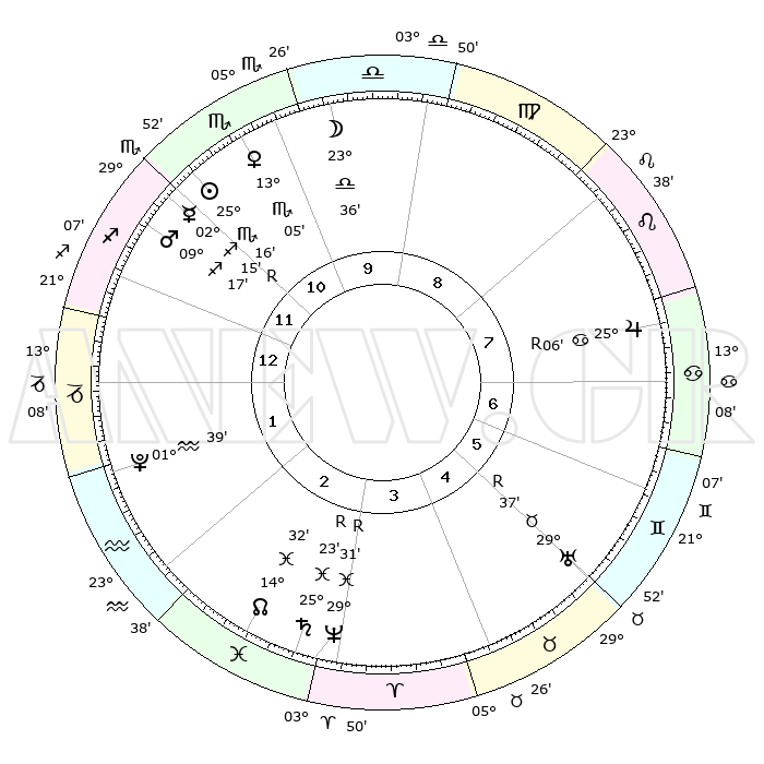 | | ΘΕΣΕΙΣ ΠΛΑΝΗΤΩΝ ΑΣΤΡΟΛΟΓΙΚΟΥ ΧΑΡΤΗ ΤΗΣ ΣΤΙΓΜΗΣ ΑΥΤΗΣ | | | | Πλανήτης | Ζώδιο | Μοίρες | Δεκαήμ. | Σε οίκο | Απόκλιση | | Ακμές των οίκων | | Ηλιος | Σκορπιός | 25°11' | Τρίτο | 11 | 19 S 03 | | 1ος | 18°33' | Τοξότης | | Σελήνη | Ζυγός | 22°44' | Τρίτο | 10 | 11 S 38 | | 2ος | 22°59' | Αιγόκερως | | Ερμής | Τοξότης | 02°20'R | Πρώτο | 12 | 21 S 07 | | 3ος | 01°43' | Ιχθείς | | Αφροδίτη | Σκορπιός | 12°59' | Δεύτερο | 11 | 14 S 38 | | 4ος | 07°09' | Κριός | | Αρης | Τοξότης | 09°13' | Πρώτο | 12 | 22 S 22 | | 5ος | 05°21' | Ταύρος | | Δίας | Καρκίνος | 25°06'R | Τρίτο | 8 | 21 N 14 | | 6ος | 28°08' | Ταύρος | | Κρόνος | Ιχθείς | 25°23'R | Τρίτο | 3 | 04 S 03 | | 7ος | 18°33' | Δίδυμοι | | Ουρανός | Ταύρος | 29°37'R | Τρίτο | 6 | 19 N 52 | | 8ος | 22°59' | Καρκίνος | | Ποσειδώνας | Ιχθείς | 29°31'R | Τρίτο | 3 | 01 S 26 | | 9ος | 01°43' | Παρθένος | | Πλούτωνας | Υδροχόος | 01°39' | Πρώτο | 2 | 23 S 28 | | 10ος | 07°09' | Ζυγός | | Β. Δεσμός | Ιχθείς | 14°32' | Δεύτερο | 3 | 06 S 05 | | 11ος | 05°21' | Σκορπιός | | Ωροσκόπος | Τοξότης | 18°33' | Δεύτερο | | | 12ος | 28°08' | Σκορπιός | | Μεσουράνημα | Ζυγός | 07°09' | Πρώτο | | | |