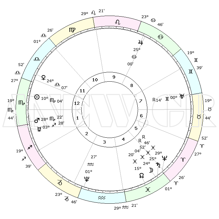 | | ΘΕΣΕΙΣ ΠΛΑΝΗΤΩΝ ΑΣΤΡΟΛΟΓΙΚΟΥ ΧΑΡΤΗ ΤΗΣ ΣΤΙΓΜΗΣ ΑΥΤΗΣ | | | | Πλανήτης | Ζώδιο | Μοίρες | Δεκαήμ. | Σε οίκο | Απόκλιση | | Ακμές των οίκων | | Ηλιος | Σκορπιός | 09°25' | Πρώτο | 7 | 14 S 38 | | 1ος | 14°21' | Κριός | | Σελήνη | Ιχθείς | 15°01' | Δεύτερο | 12 | 06 S 04 | | 2ος | 20°54' | Ταύρος | | Ερμής | Τοξότης | 02°56' | Πρώτο | 8 | 23 S 35 | | 3ος | 16°17' | Δίδυμοι | | Αφροδίτη | Ζυγός | 23°19' | Τρίτο | 7 | 07 S 42 | | 4ος | 08°07' | Καρκίνος | | Αρης | Σκορπιός | 27°54' | Τρίτο | 8 | 20 S 04 | | 5ος | 01°13' | Λέων | | Δίας | Καρκίνος | 24°59' | Τρίτο | 4 | 21 N 13 | | 6ος | 00°59' | Παρθένος | | Κρόνος | Ιχθείς | 25°54'R | Τρίτο | 12 | 03 S 54 | | 7ος | 14°21' | Ζυγός | | Ουρανός | Δίδυμοι | 00°15'R | Πρώτο | 2 | 20 N 00 | | 8ος | 20°54' | Σκορπιός | | Ποσειδώνας | Ιχθείς | 29°47'R | Τρίτο | 12 | 01 S 21 | | 9ος | 16°17' | Τοξότης | | Πλούτωνας | Υδροχόος | 01°27' | Πρώτο | 11 | 23 S 31 | | 10ος | 08°07' | Αιγόκερως | | Β. Δεσμός | Ιχθείς | 15°22' | Δεύτερο | 12 | 05 S 46 | | 11ος | 01°13' | Υδροχόος | | Ωροσκόπος | Κριός | 14°21' | Δεύτερο | | | 12ος | 00°59' | Ιχθείς | | Μεσουράνημα | Αιγόκερως | 08°07' | Πρώτο | | | |