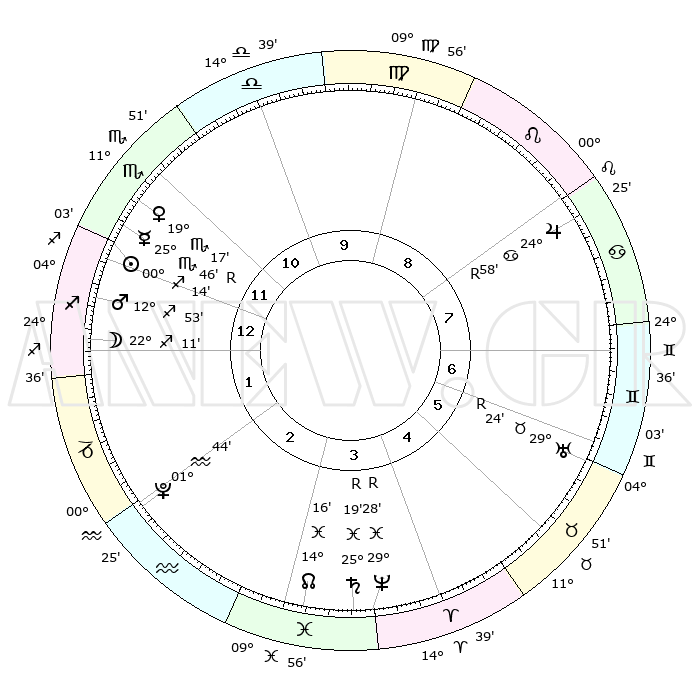 | | ΘΕΣΕΙΣ ΠΛΑΝΗΤΩΝ ΑΣΤΡΟΛΟΓΙΚΟΥ ΧΑΡΤΗ ΤΗΣ ΣΤΙΓΜΗΣ ΑΥΤΗΣ | | | | Πλανήτης | Ζώδιο | Μοίρες | Δεκαήμ. | Σε οίκο | Απόκλιση | | Ακμές των οίκων | | Ηλιος | Τοξότης | 00°11' | Πρώτο | 12 | 20 S 11 | | 1ος | 09°48' | Τοξότης | | Σελήνη | Τοξότης | 21°37' | Τρίτο | 1 | 28 S 08 | | 2ος | 12°30' | Αιγόκερως | | Ερμής | Σκορπιός | 25°50'R | Τρίτο | 12 | 18 S 06 | | 3ος | 19°51' | Υδροχόος | | Αφροδίτη | Σκορπιός | 19°13' | Δεύτερο | 11 | 16 S 34 | | 4ος | 25°51' | Ιχθείς | | Αρης | Τοξότης | 12°51' | Δεύτερο | 1 | 22 S 55 | | 5ος | 25°30' | Κριός | | Δίας | Καρκίνος | 24°58'R | Τρίτο | 8 | 21 N 16 | | 6ος | 19°16' | Ταύρος | | Κρόνος | Ιχθείς | 25°19'R | Τρίτο | 3 | 04 S 04 | | 7ος | 09°48' | Δίδυμοι | | Ουρανός | Ταύρος | 29°25'R | Τρίτο | 6 | 19 N 49 | | 8ος | 12°30' | Καρκίνος | | Ποσειδώνας | Ιχθείς | 29°28'R | Τρίτο | 4 | 01 S 28 | | 9ος | 19°51' | Λέων | | Πλούτωνας | Υδροχόος | 01°44' | Πρώτο | 2 | 23 S 26 | | 10ος | 25°51' | Παρθένος | | Β. Δεσμός | Ιχθείς | 14°16' | Δεύτερο | 3 | 06 S 11 | | 11ος | 25°30' | Ζυγός | | Ωροσκόπος | Τοξότης | 09°48' | Πρώτο | | | 12ος | 19°16' | Σκορπιός | | Μεσουράνημα | Παρθένος | 25°51' | Τρίτο | | | |