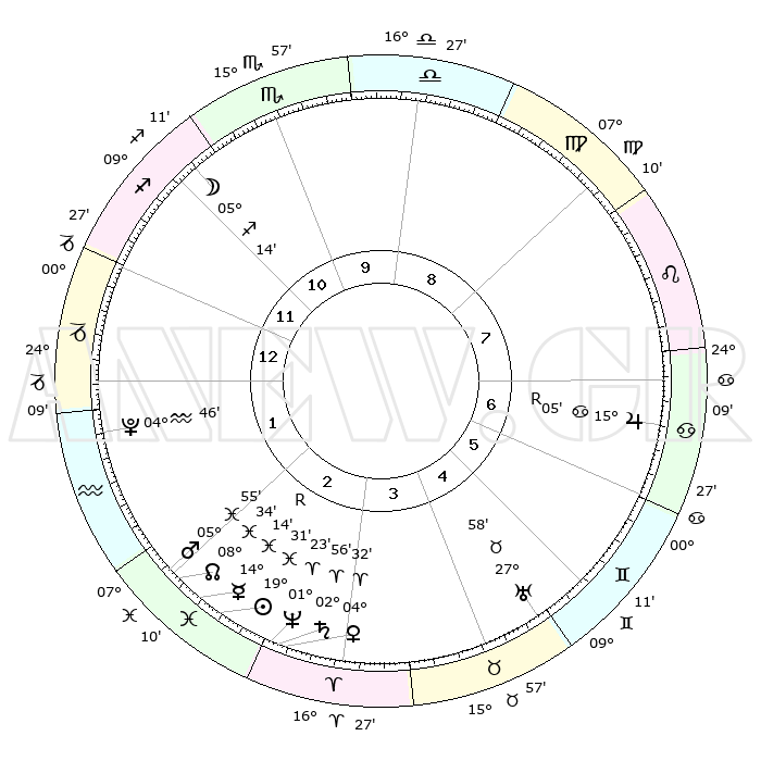 | | ΘΕΣΕΙΣ ΠΛΑΝΗΤΩΝ ΑΣΤΡΟΛΟΓΙΚΟΥ ΧΑΡΤΗ ΤΗΣ ΣΤΙΓΜΗΣ ΑΥΤΗΣ | | | | Πλανήτης | Ζώδιο | Μοίρες | Δεκαήμ. | Σε οίκο | Απόκλιση | | Ακμές των οίκων | | Ηλιος | Ιχθείς | 19°27' | Δεύτερο | 2 | 04 S 10 | | 1ος | 02°57' | Αιγόκερως | | Σελήνη | Τοξότης | 04°33' | Πρώτο | 11 | 26 S 13 | | 2ος | 10°52' | Υδροχόος | | Ερμής | Ιχθείς | 14°18'R | Δεύτερο | 2 | 03 S 04 | | 3ος | 21°02' | Ιχθείς | | Αφροδίτη | Κριός | 04°28' | Πρώτο | 3 | 00 N 42 | | 4ος | 24°29' | Κριός | | Αρης | Ιχθείς | 05°52' | Πρώτο | 2 | 10 S 22 | | 5ος | 20°20' | Ταύρος | | Δίας | Καρκίνος | 15°05'R | Δεύτερο | 7 | 22 N 56 | | 6ος | 11°58' | Δίδυμοι | | Κρόνος | Κριός | 02°56' | Πρώτο | 3 | 00 S 47 | | 7ος | 02°57' | Καρκίνος | | Ουρανός | Ταύρος | 27°58' | Τρίτο | 5 | 19 N 32 | | 8ος | 10°52' | Λέων | | Ποσειδώνας | Κριός | 01°23' | Πρώτο | 3 | 00 S 39 | | 9ος | 21°02' | Παρθένος | | Πλούτωνας | Υδροχόος | 04°46' | Πρώτο | 1 | 22 S 50 | | 10ος | 24°29' | Ζυγός | | Β. Δεσμός | Ιχθείς | 08°34' | Πρώτο | 2 | 08 S 21 | | 11ος | 20°20' | Σκορπιός | | Ωροσκόπος | Αιγόκερως | 02°57' | Πρώτο | | | 12ος | 11°58' | Τοξότης | | Μεσουράνημα | Ζυγός | 24°29' | Τρίτο | | | |