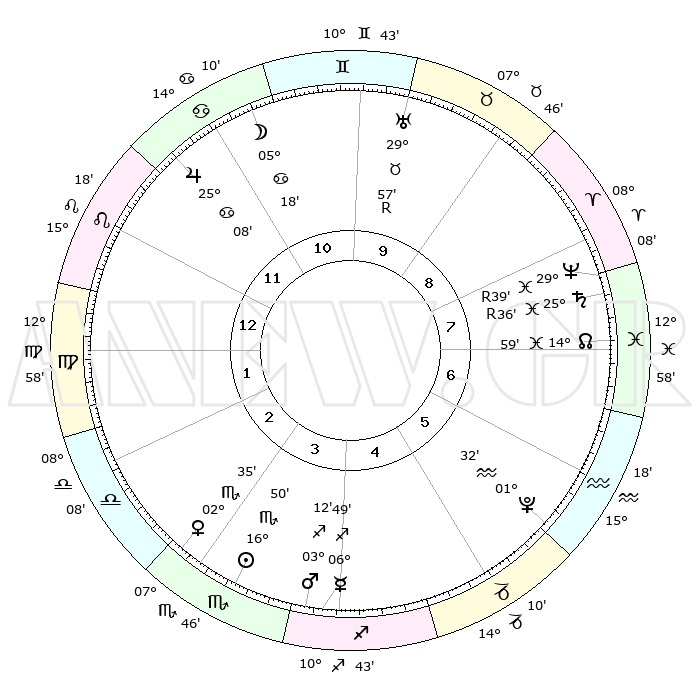 | | ΘΕΣΕΙΣ ΠΛΑΝΗΤΩΝ ΑΣΤΡΟΛΟΓΙΚΟΥ ΧΑΡΤΗ ΤΗΣ ΣΤΙΓΜΗΣ ΑΥΤΗΣ | | | | Πλανήτης | Ζώδιο | Μοίρες | Δεκαήμ. | Σε οίκο | Απόκλιση | | Ακμές των οίκων | | Ηλιος | Σκορπιός | 16°45' | Δεύτερο | 4 | 16 S 50 | | 1ος | 20°18' | Λέων | | Σελήνη | Καρκίνος | 04°10' | Πρώτο | 11 | 28 N 12 | | 2ος | 13°09' | Παρθένος | | Ερμής | Τοξότης | 06°48' | Πρώτο | 4 | 23 S 53 | | 3ος | 10°49' | Ζυγός | | Αφροδίτη | Σκορπιός | 02°29' | Πρώτο | 3 | 11 S 04 | | 4ος | 13°30' | Σκορπιός | | Αρης | Τοξότης | 03°09' | Πρώτο | 4 | 21 S 14 | | 5ος | 18°24' | Τοξότης | | Δίας | Καρκίνος | 25°08' | Τρίτο | 12 | 21 N 12 | | 6ος | 21°15' | Αιγόκερως | | Κρόνος | Ιχθείς | 25°37'R | Τρίτο | 8 | 03 S 59 | | 7ος | 20°18' | Υδροχόος | | Ουρανός | Ταύρος | 29°58'R | Τρίτο | 10 | 19 N 56 | | 8ος | 13°09' | Ιχθείς | | Ποσειδώνας | Ιχθείς | 29°39'R | Τρίτο | 8 | 01 S 24 | | 9ος | 10°49' | Κριός | | Πλούτωνας | Υδροχόος | 01°32' | Πρώτο | 6 | 23 S 29 | | 10ος | 13°30' | Ταύρος | | Β. Δεσμός | Ιχθείς | 14°59' | Δεύτερο | 8 | 05 S 55 | | 11ος | 18°24' | Δίδυμοι | | Ωροσκόπος | Λέων | 20°18' | Τρίτο | | | 12ος | 21°15' | Καρκίνος | | Μεσουράνημα | Ταύρος | 13°30' | Δεύτερο | | | |