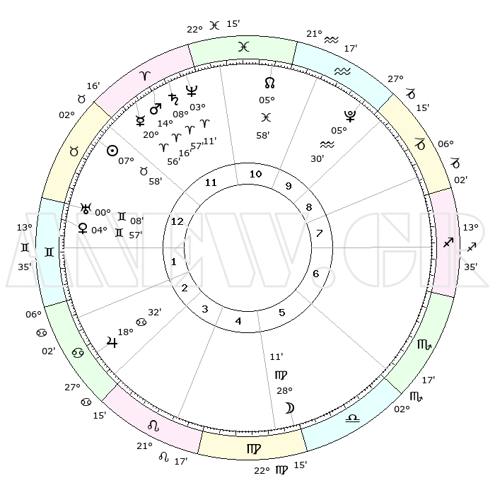| | ΘΕΣΕΙΣ ΠΛΑΝΗΤΩΝ ΑΣΤΡΟΛΟΓΙΚΟΥ ΧΑΡΤΗ ΤΗΣ ΣΤΙΓΜΗΣ ΑΥΤΗΣ | | | | Πλανήτης | Ζώδιο | Μοίρες | Δεκαήμ. | Σε οίκο | Απόκλιση | | Ακμές των οίκων | | Ηλιος | Ταύρος | 07°54' | Πρώτο | 12 | 14 N 08 | | 1ος | 16°09' | Ταύρος | | Σελήνη | Παρθένος | 27°22' | Τρίτο | 5 | 00 S 33 | | 2ος | 14°05' | Δίδυμοι | | Ερμής | Κριός | 20°49' | Τρίτο | 12 | 06 N 05 | | 3ος | 06°15' | Καρκίνος | | Αφροδίτη | Δίδυμοι | 04°52' | Πρώτο | 1 | 21 N 52 | | 4ος | 28°15' | Καρκίνος | | Αρης | Κριός | 14°13' | Δεύτερο | 12 | 04 N 46 | | 5ος | 24°34' | Λέων | | Δίας | Καρκίνος | 18°32' | Δεύτερο | 3 | 22 N 32 | | 6ος | 00°30' | Ζυγός | | Κρόνος | Κριός | 08°56' | Πρώτο | 12 | 01 N 33 | | 7ος | 16°09' | Σκορπιός | | Ουρανός | Δίδυμοι | 00°07' | Πρώτο | 1 | 20 N 01 | | 8ος | 14°05' | Τοξότης | | Ποσειδώνας | Κριός | 03°10' | Πρώτο | 12 | 00 N 03 | | 9ος | 06°15' | Αιγόκερως | | Πλούτωνας | Υδροχόος | 05°30' | Πρώτο | 10 | 22 S 48 | | 10ος | 28°15' | Αιγόκερως | | Β. Δεσμός | Ιχθείς | 05°58' | Πρώτο | 11 | 09 S 19 | | 11ος | 24°34' | Υδροχόος | | Ωροσκόπος | Ταύρος | 16°09' | Δεύτερο | | | 12ος | 00°30' | Κριός | | Μεσουράνημα | Αιγόκερως | 28°15' | Τρίτο | | | |