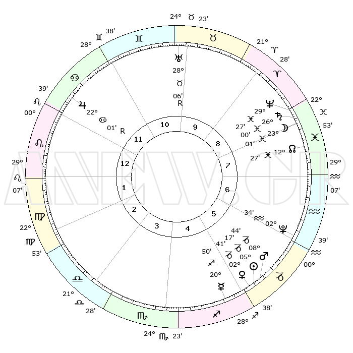 | | ΘΕΣΕΙΣ ΠΛΑΝΗΤΩΝ ΑΣΤΡΟΛΟΓΙΚΟΥ ΧΑΡΤΗ ΤΗΣ ΣΤΙΓΜΗΣ ΑΥΤΗΣ | | | | Πλανήτης | Ζώδιο | Μοίρες | Δεκαήμ. | Σε οίκο | Απόκλιση | | Ακμές των οίκων | | Ηλιος | Αιγόκερως | 05°12' | Πρώτο | 5 | 23 S 20 | | 1ος | 06°23' | Λέων | | Σελήνη | Ιχθείς | 21°58' | Τρίτο | 8 | 02 S 19 | | 2ος | 27°54' | Λέων | | Ερμής | Τοξότης | 20°43' | Τρίτο | 5 | 23 S 04 | | 3ος | 23°48' | Παρθένος | | Αφροδίτη | Αιγόκερως | 02°36' | Πρώτο | 5 | 23 S 43 | | 4ος | 25°33' | Ζυγός | | Αρης | Αιγόκερως | 08°40' | Πρώτο | 6 | 24 S 00 | | 5ος | 01°21' | Τοξότης | | Δίας | Καρκίνος | 22°02'R | Τρίτο | 12 | 21 N 51 | | 6ος | 06°03' | Αιγόκερως | | Κρόνος | Ιχθείς | 26°00' | Τρίτο | 9 | 03 S 41 | | 7ος | 06°23' | Υδροχόος | | Ουρανός | Ταύρος | 28°06'R | Τρίτο | 10 | 19 N 32 | | 8ος | 27°54' | Υδροχόος | | Ποσειδώνας | Ιχθείς | 29°27' | Τρίτο | 9 | 01 S 27 | | 9ος | 23°48' | Ιχθείς | | Πλούτωνας | Υδροχόος | 02°34' | Πρώτο | 6 | 23 S 15 | | 10ος | 25°33' | Κριός | | Β. Δεσμός | Ιχθείς | 12°27' | Δεύτερο | 8 | 06 S 53 | | 11ος | 01°21' | Δίδυμοι | | Ωροσκόπος | Λέων | 06°23' | Πρώτο | | | 12ος | 06°03' | Καρκίνος | | Μεσουράνημα | Κριός | 25°33' | Τρίτο | | | |