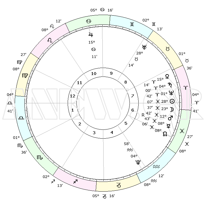 | | ΘΕΣΕΙΣ ΠΛΑΝΗΤΩΝ ΑΣΤΡΟΛΟΓΙΚΟΥ ΧΑΡΤΗ ΤΗΣ ΣΤΙΓΜΗΣ ΑΥΤΗΣ | | | | Πλανήτης | Ζώδιο | Μοίρες | Δεκαήμ. | Σε οίκο | Απόκλιση | | Ακμές των οίκων | | Ηλιος | Ιχθείς | 28°03' | Τρίτο | 7 | 00 S 47 | | 1ος | 15°14' | Παρθένος | | Σελήνη | Ιχθείς | 22°42' | Τρίτο | 7 | 01 S 45 | | 2ος | 10°37' | Ζυγός | | Ερμής | Ιχθείς | 08°44'R | Πρώτο | 6 | 06 S 53 | | 3ος | 10°23' | Σκορπιός | | Αφροδίτη | Κριός | 15°09' | Δεύτερο | 8 | 05 N 06 | | 4ος | 13°19' | Τοξότης | | Αρης | Ιχθείς | 12°39' | Δεύτερο | 6 | 07 S 49 | | 5ος | 16°40' | Αιγόκερως | | Δίας | Καρκίνος | 15°11' | Δεύτερο | 10 | 22 N 56 | | 6ος | 17°42' | Υδροχόος | | Κρόνος | Κριός | 03°60' | Πρώτο | 7 | 00 S 22 | | 7ος | 15°14' | Ιχθείς | | Ουρανός | Ταύρος | 28°14' | Τρίτο | 9 | 19 N 36 | | 8ος | 10°37' | Κριός | | Ποσειδώνας | Κριός | 01°42' | Πρώτο | 7 | 00 S 31 | | 9ος | 10°23' | Ταύρος | | Πλούτωνας | Υδροχόος | 04°58' | Πρώτο | 5 | 22 S 49 | | 10ος | 13°19' | Δίδυμοι | | Β. Δεσμός | Ιχθείς | 08°07' | Πρώτο | 6 | 08 S 32 | | 11ος | 16°40' | Καρκίνος | | Ωροσκόπος | Παρθένος | 15°14' | Δεύτερο | | | 12ος | 17°42' | Λέων | | Μεσουράνημα | Δίδυμοι | 13°19' | Δεύτερο | | | |