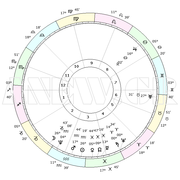 | | ΘΕΣΕΙΣ ΠΛΑΝΗΤΩΝ ΑΣΤΡΟΛΟΓΙΚΟΥ ΧΑΡΤΗ ΤΗΣ ΣΤΙΓΜΗΣ ΑΥΤΗΣ | | | | Πλανήτης | Ζώδιο | Μοίρες | Δεκαήμ. | Σε οίκο | Απόκλιση | | Ακμές των οίκων | | Ηλιος | Υδροχόος | 26°15' | Τρίτο | 4 | 12 S 46 | | 1ος | 16°29' | Σκορπιός | | Σελήνη | Αιγόκερως | 25°59' | Τρίτο | 3 | 24 S 29 | | 2ος | 16°05' | Τοξότης | | Ερμής | Ιχθείς | 13°11' | Δεύτερο | 4 | 06 S 34 | | 3ος | 19°46' | Αιγόκερως | | Αφροδίτη | Ιχθείς | 05°40' | Πρώτο | 4 | 10 S 48 | | 4ος | 25°08' | Υδροχόος | | Αρης | Υδροχόος | 17°41' | Δεύτερο | 3 | 16 S 33 | | 5ος | 27°28' | Ιχθείς | | Δίας | Καρκίνος | 16°02'R | Δεύτερο | 8 | 22 N 48 | | 6ος | 24°19' | Κριός | | Κρόνος | Κριός | 00°13' | Πρώτο | 5 | 01 S 53 | | 7ος | 16°29' | Ταύρος | | Ουρανός | Ταύρος | 27°31' | Τρίτο | 7 | 19 N 25 | | 8ος | 16°05' | Δίδυμοι | | Ποσειδώνας | Κριός | 00°34' | Πρώτο | 5 | 00 S 59 | | 9ος | 19°46' | Καρκίνος | | Πλούτωνας | Υδροχόος | 04°08' | Πρώτο | 3 | 22 S 57 | | 10ος | 25°08' | Λέων | | Β. Δεσμός | Ιχθείς | 09°47' | Πρώτο | 4 | 07 S 54 | | 11ος | 27°28' | Παρθένος | | Ωροσκόπος | Σκορπιός | 16°29' | Δεύτερο | | | 12ος | 24°19' | Ζυγός | | Μεσουράνημα | Λέων | 25°08' | Τρίτο | | | |