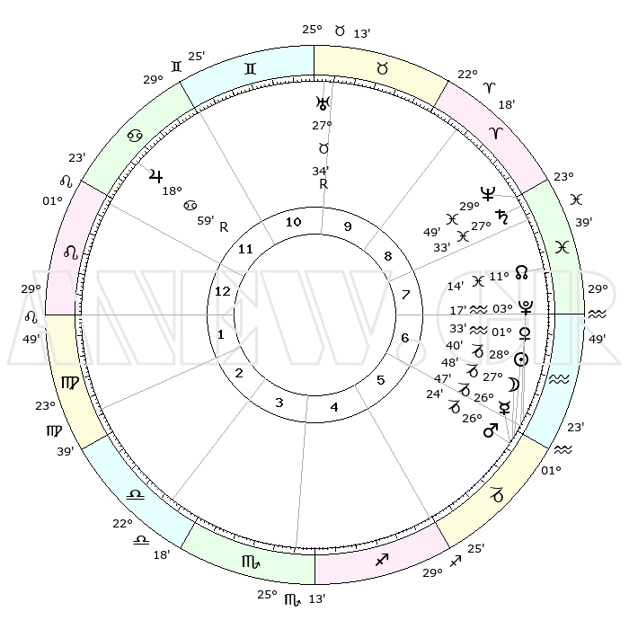 | | ΘΕΣΕΙΣ ΠΛΑΝΗΤΩΝ ΑΣΤΡΟΛΟΓΙΚΟΥ ΧΑΡΤΗ ΤΗΣ ΣΤΙΓΜΗΣ ΑΥΤΗΣ | | | | Πλανήτης | Ζώδιο | Μοίρες | Δεκαήμ. | Σε οίκο | Απόκλιση | | Ακμές των οίκων | | Ηλιος | Αιγόκερως | 28°36' | Τρίτο | 6 | 20 S 26 | | 1ος | 11°54' | Λέων | | Σελήνη | Αιγόκερως | 27°01' | Τρίτο | 6 | 24 S 10 | | 2ος | 03°54' | Παρθένος | | Ερμής | Αιγόκερως | 26°41' | Τρίτο | 6 | 22 S 44 | | 3ος | 00°33' | Ζυγός | | Αφροδίτη | Υδροχόος | 01°28' | Πρώτο | 6 | 20 S 53 | | 4ος | 02°46' | Σκορπιός | | Αρης | Αιγόκερως | 26°21' | Τρίτο | 6 | 21 S 51 | | 5ος | 08°15' | Τοξότης | | Δίας | Καρκίνος | 18°59'R | Δεύτερο | 12 | 22 N 22 | | 6ος | 12°08' | Αιγόκερως | | Κρόνος | Ιχθείς | 27°33' | Τρίτο | 8 | 03 S 00 | | 7ος | 11°54' | Υδροχόος | | Ουρανός | Ταύρος | 27°34'R | Τρίτο | 10 | 19 N 26 | | 8ος | 03°54' | Ιχθείς | | Ποσειδώνας | Ιχθείς | 29°49' | Τρίτο | 8 | 01 S 17 | | 9ος | 00°33' | Κριός | | Πλούτωνας | Υδροχόος | 03°17' | Πρώτο | 6 | 23 S 06 | | 10ος | 02°46' | Ταύρος | | Β. Δεσμός | Ιχθείς | 11°14' | Δεύτερο | 8 | 07 S 21 | | 11ος | 08°15' | Δίδυμοι | | Ωροσκόπος | Λέων | 11°54' | Δεύτερο | | | 12ος | 12°08' | Καρκίνος | | Μεσουράνημα | Ταύρος | 02°46' | Πρώτο | | | |