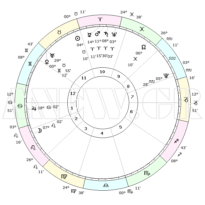 | | ΘΕΣΕΙΣ ΠΛΑΝΗΤΩΝ ΑΣΤΡΟΛΟΓΙΚΟΥ ΧΑΡΤΗ ΤΗΣ ΣΤΙΓΜΗΣ ΑΥΤΗΣ | | | | Πλανήτης | Ζώδιο | Μοίρες | Δεκαήμ. | Σε οίκο | Απόκλιση | | Ακμές των οίκων | | Ηλιος | Ταύρος | 04°06' | Πρώτο | 11 | 12 N 53 | | 1ος | 21°58' | Δίδυμοι | | Σελήνη | Λέων | 06°09' | Πρώτο | 3 | 21 N 18 | | 2ος | 13°25' | Καρκίνος | | Ερμής | Κριός | 14°04' | Δεύτερο | 11 | 03 N 16 | | 3ος | 04°48' | Λέων | | Αφροδίτη | Δίδυμοι | 00°08' | Πρώτο | 12 | 20 N 45 | | 4ος | 29°55' | Λέων | | Αρης | Κριός | 11°12' | Δεύτερο | 11 | 03 N 35 | | 5ος | 02°28' | Ζυγός | | Δίας | Καρκίνος | 18°02' | Δεύτερο | 2 | 22 N 36 | | 6ος | 12°46' | Σκορπιός | | Κρόνος | Κριός | 08°29' | Πρώτο | 11 | 01 N 23 | | 7ος | 21°59' | Τοξότης | | Ουρανός | Ταύρος | 29°54' | Τρίτο | 12 | 19 N 58 | | 8ος | 13°25' | Αιγόκερως | | Ποσειδώνας | Κριός | 03°03' | Πρώτο | 11 | 00 N 00 | | 9ος | 04°48' | Υδροχόος | | Πλούτωνας | Υδροχόος | 05°28' | Πρώτο | 9 | 22 S 48 | | 10ος | 29°55' | Υδροχόος | | Β. Δεσμός | Ιχθείς | 06°10' | Πρώτο | 10 | 09 S 15 | | 11ος | 02°28' | Κριός | | Ωροσκόπος | Δίδυμοι | 21°58' | Τρίτο | | | 12ος | 12°46' | Ταύρος | | Μεσουράνημα | Υδροχόος | 29°55' | Τρίτο | | | |