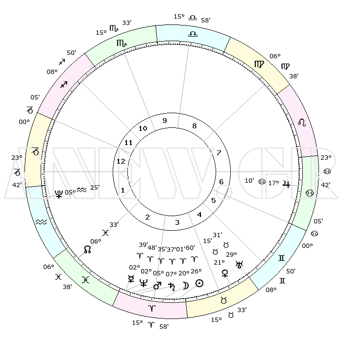 | | ΘΕΣΕΙΣ ΠΛΑΝΗΤΩΝ ΑΣΤΡΟΛΟΓΙΚΟΥ ΧΑΡΤΗ ΤΗΣ ΣΤΙΓΜΗΣ ΑΥΤΗΣ | | | | Πλανήτης | Ζώδιο | Μοίρες | Δεκαήμ. | Σε οίκο | Απόκλιση | | Ακμές των οίκων | | Ηλιος | Κριός | 26°55' | Τρίτο | 4 | 10 N 22 | | 1ος | 27°18' | Τοξότης | | Σελήνη | Κριός | 18°57' | Δεύτερο | 4 | 10 N 32 | | 2ος | 03°46' | Υδροχόος | | Ερμής | Κριός | 02°33' | Πρώτο | 3 | 01 S 24 | | 3ος | 13°33' | Ιχθείς | | Αφροδίτη | Ταύρος | 21°10' | Τρίτο | 5 | 18 N 18 | | 4ος | 17°54' | Κριός | | Αρης | Κριός | 05°31' | Πρώτο | 3 | 01 N 18 | | 5ος | 14°39' | Ταύρος | | Δίας | Καρκίνος | 17°10' | Δεύτερο | 7 | 22 N 43 | | 6ος | 06°39' | Δίδυμοι | | Κρόνος | Κριός | 07°37' | Πρώτο | 3 | 01 N 03 | | 7ος | 27°18' | Δίδυμοι | | Ουρανός | Ταύρος | 29°31' | Τρίτο | 5 | 19 N 53 | | 8ος | 03°46' | Λέων | | Ποσειδώνας | Κριός | 02°47' | Πρώτο | 3 | 00 S 06 | | 9ος | 13°33' | Παρθένος | | Πλούτωνας | Υδροχόος | 05°25' | Πρώτο | 2 | 22 S 47 | | 10ος | 17°54' | Ζυγός | | Β. Δεσμός | Ιχθείς | 06°34' | Πρώτο | 2 | 09 S 06 | | 11ος | 14°39' | Σκορπιός | | Ωροσκόπος | Τοξότης | 27°18' | Τρίτο | | | 12ος | 06°39' | Τοξότης | | Μεσουράνημα | Ζυγός | 17°54' | Δεύτερο | | | |