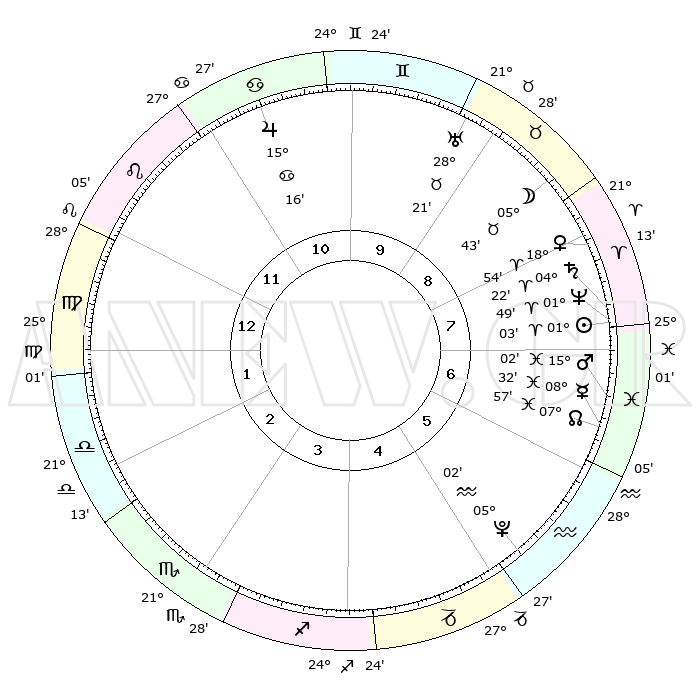 | | ΘΕΣΕΙΣ ΠΛΑΝΗΤΩΝ ΑΣΤΡΟΛΟΓΙΚΟΥ ΧΑΡΤΗ ΤΗΣ ΣΤΙΓΜΗΣ ΑΥΤΗΣ | | | | Πλανήτης | Ζώδιο | Μοίρες | Δεκαήμ. | Σε οίκο | Απόκλιση | | Ακμές των οίκων | | Ηλιος | Κριός | 00°59' | Πρώτο | 8 | 00 N 24 | | 1ος | 04°37' | Παρθένος | | Σελήνη | Ταύρος | 04°42' | Πρώτο | 9 | 17 N 10 | | 2ος | 28°57' | Παρθένος | | Ερμής | Ιχθείς | 08°31' | Πρώτο | 7 | 07 S 38 | | 3ος | 28°01' | Ζυγός | | Αφροδίτη | Κριός | 18°49' | Δεύτερο | 8 | 06 N 36 | | 4ος | 00°58' | Τοξότης | | Αρης | Ιχθείς | 14°58' | Δεύτερο | 7 | 06 S 54 | | 5ος | 04°52' | Αιγόκερως | | Δίας | Καρκίνος | 15°16' | Δεύτερο | 11 | 22 N 55 | | 6ος | 06°29' | Υδροχόος | | Κρόνος | Κριός | 04°22' | Πρώτο | 8 | 00 S 13 | | 7ος | 04°37' | Ιχθείς | | Ουρανός | Ταύρος | 28°21' | Τρίτο | 9 | 19 N 37 | | 8ος | 28°57' | Ιχθείς | | Ποσειδώνας | Κριός | 01°49' | Πρώτο | 8 | 00 S 29 | | 9ος | 28°01' | Κριός | | Πλούτωνας | Υδροχόος | 05°02' | Πρώτο | 5 | 22 S 48 | | 10ος | 00°58' | Δίδυμοι | | Β. Δεσμός | Ιχθείς | 07°57' | Πρώτο | 7 | 08 S 35 | | 11ος | 04°52' | Καρκίνος | | Ωροσκόπος | Παρθένος | 04°37' | Πρώτο | | | 12ος | 06°29' | Λέων | | Μεσουράνημα | Δίδυμοι | 00°58' | Πρώτο | | | |