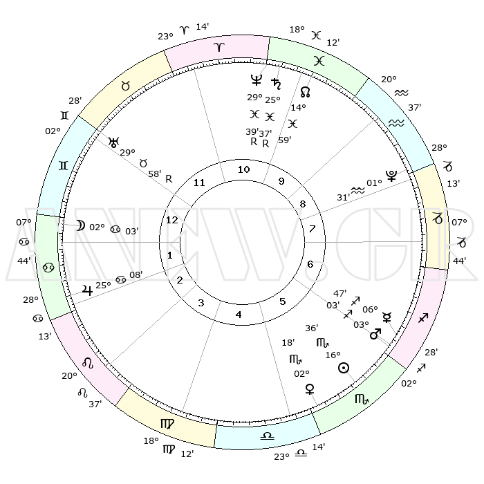 | | ΘΕΣΕΙΣ ΠΛΑΝΗΤΩΝ ΑΣΤΡΟΛΟΓΙΚΟΥ ΧΑΡΤΗ ΤΗΣ ΣΤΙΓΜΗΣ ΑΥΤΗΣ | | | | Πλανήτης | Ζώδιο | Μοίρες | Δεκαήμ. | Σε οίκο | Απόκλιση | | Ακμές των οίκων | | Ηλιος | Σκορπιός | 16°32' | Δεύτερο | 6 | 16 S 46 | | 1ος | 12°26' | Δίδυμοι | | Σελήνη | Καρκίνος | 00°58' | Πρώτο | 1 | 28 N 20 | | 2ος | 05°04' | Καρκίνος | | Ερμής | Τοξότης | 06°47' | Πρώτο | 6 | 23 S 54 | | 3ος | 26°16' | Καρκίνος | | Αφροδίτη | Σκορπιός | 02°12' | Πρώτο | 6 | 10 S 58 | | 4ος | 20°11' | Λέων | | Αρης | Τοξότης | 02°60' | Πρώτο | 6 | 21 S 12 | | 5ος | 20°55' | Παρθένος | | Δίας | Καρκίνος | 25°08' | Τρίτο | 2 | 21 N 12 | | 6ος | 00°52' | Σκορπιός | | Κρόνος | Ιχθείς | 25°37'R | Τρίτο | 11 | 03 S 59 | | 7ος | 12°26' | Τοξότης | | Ουρανός | Ταύρος | 29°58'R | Τρίτο | 12 | 19 N 56 | | 8ος | 05°04' | Αιγόκερως | | Ποσειδώνας | Ιχθείς | 29°39'R | Τρίτο | 11 | 01 S 24 | | 9ος | 26°16' | Αιγόκερως | | Πλούτωνας | Υδροχόος | 01°31' | Πρώτο | 9 | 23 S 30 | | 10ος | 20°11' | Υδροχόος | | Β. Δεσμός | Ιχθείς | 14°60' | Δεύτερο | 10 | 05 S 55 | | 11ος | 20°55' | Ιχθείς | | Ωροσκόπος | Δίδυμοι | 12°26' | Δεύτερο | | | 12ος | 00°52' | Ταύρος | | Μεσουράνημα | Υδροχόος | 20°11' | Τρίτο | | | |