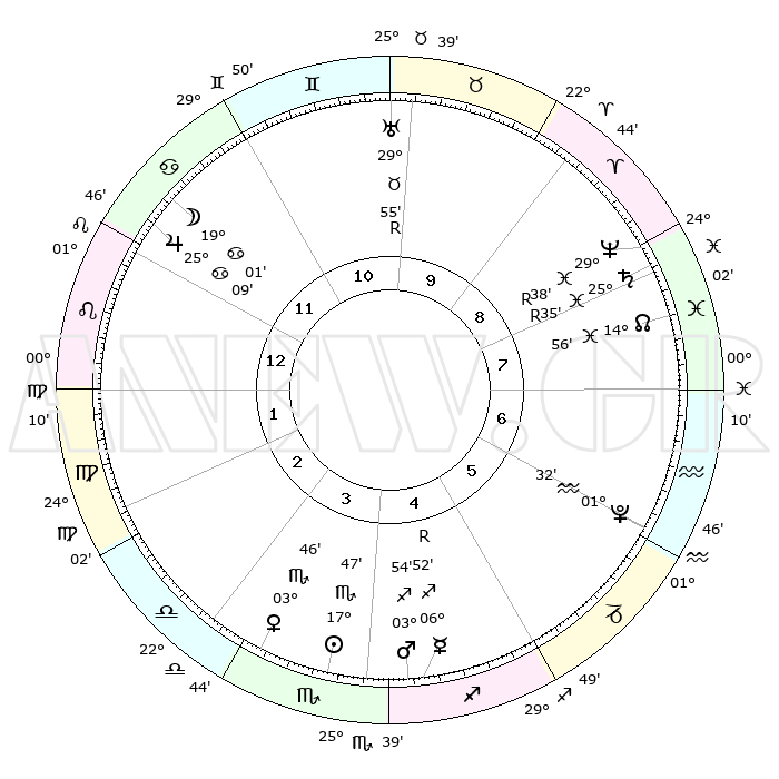 | | ΘΕΣΕΙΣ ΠΛΑΝΗΤΩΝ ΑΣΤΡΟΛΟΓΙΚΟΥ ΧΑΡΤΗ ΤΗΣ ΣΤΙΓΜΗΣ ΑΥΤΗΣ | | | | Πλανήτης | Ζώδιο | Μοίρες | Δεκαήμ. | Σε οίκο | Απόκλιση | | Ακμές των οίκων | | Ηλιος | Σκορπιός | 17°39' | Δεύτερο | 5 | 17 S 05 | | 1ος | 20°05' | Καρκίνος | | Σελήνη | Καρκίνος | 17°04' | Δεύτερο | 12 | 26 N 40 | | 2ος | 10°38' | Λέων | | Ερμής | Τοξότης | 06°52' | Πρώτο | 5 | 23 S 46 | | 3ος | 04°23' | Παρθένος | | Αφροδίτη | Σκορπιός | 03°36' | Πρώτο | 4 | 11 S 28 | | 4ος | 04°00' | Ζυγός | | Αρης | Τοξότης | 03°48' | Πρώτο | 5 | 21 S 22 | | 5ος | 10°00' | Σκορπιός | | Δίας | Καρκίνος | 25°09' | Τρίτο | 1 | 21 N 12 | | 6ος | 17°23' | Τοξότης | | Κρόνος | Ιχθείς | 25°35'R | Τρίτο | 9 | 04 S 00 | | 7ος | 20°05' | Αιγόκερως | | Ουρανός | Ταύρος | 29°55'R | Τρίτο | 11 | 19 N 56 | | 8ος | 10°38' | Υδροχόος | | Ποσειδώνας | Ιχθείς | 29°38'R | Τρίτο | 9 | 01 S 24 | | 9ος | 04°23' | Ιχθείς | | Πλούτωνας | Υδροχόος | 01°32' | Πρώτο | 7 | 23 S 29 | | 10ος | 04°00' | Κριός | | Β. Δεσμός | Ιχθείς | 14°56' | Δεύτερο | 9 | 05 S 56 | | 11ος | 10°00' | Ταύρος | | Ωροσκόπος | Καρκίνος | 20°05' | Τρίτο | | | 12ος | 17°23' | Δίδυμοι | | Μεσουράνημα | Κριός | 04°00' | Πρώτο | | | |