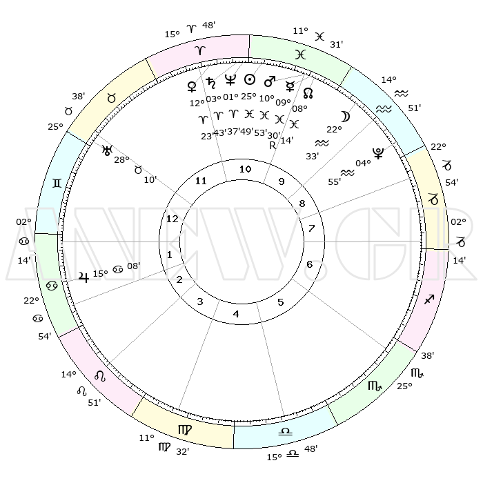 | | ΘΕΣΕΙΣ ΠΛΑΝΗΤΩΝ ΑΣΤΡΟΛΟΓΙΚΟΥ ΧΑΡΤΗ ΤΗΣ ΣΤΙΓΜΗΣ ΑΥΤΗΣ | | | | Πλανήτης | Ζώδιο | Μοίρες | Δεκαήμ. | Σε οίκο | Απόκλιση | | Ακμές των οίκων | | Ηλιος | Ιχθείς | 25°46' | Τρίτο | 11 | 01 S 41 | | 1ος | 11°59' | Δίδυμοι | | Σελήνη | Υδροχόος | 21°48' | Τρίτο | 10 | 15 S 43 | | 2ος | 04°40' | Καρκίνος | | Ερμής | Ιχθείς | 09°31'R | Πρώτο | 10 | 06 S 03 | | 3ος | 25°53' | Καρκίνος | | Αφροδίτη | Κριός | 12°18' | Δεύτερο | 11 | 03 N 56 | | 4ος | 19°44' | Λέων | | Αρης | Ιχθείς | 10°51' | Δεύτερο | 10 | 08 S 30 | | 5ος | 20°24' | Παρθένος | | Δίας | Καρκίνος | 15°08' | Δεύτερο | 2 | 22 N 56 | | 6ος | 00°18' | Σκορπιός | | Κρόνος | Κριός | 03°43' | Πρώτο | 11 | 00 S 29 | | 7ος | 11°59' | Τοξότης | | Ουρανός | Ταύρος | 28°09' | Τρίτο | 12 | 19 N 34 | | 8ος | 04°40' | Αιγόκερως | | Ποσειδώνας | Κριός | 01°37' | Πρώτο | 11 | 00 S 33 | | 9ος | 25°53' | Αιγόκερως | | Πλούτωνας | Υδροχόος | 04°55' | Πρώτο | 9 | 22 S 49 | | 10ος | 19°44' | Υδροχόος | | Β. Δεσμός | Ιχθείς | 08°14' | Πρώτο | 10 | 08 S 29 | | 11ος | 20°24' | Ιχθείς | | Ωροσκόπος | Δίδυμοι | 11°59' | Δεύτερο | | | 12ος | 00°18' | Ταύρος | | Μεσουράνημα | Υδροχόος | 19°44' | Δεύτερο | | | |