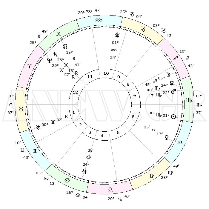 | | ΘΕΣΕΙΣ ΠΛΑΝΗΤΩΝ ΑΣΤΡΟΛΟΓΙΚΟΥ ΧΑΡΤΗ ΤΗΣ ΣΤΙΓΜΗΣ ΑΥΤΗΣ | | | | Πλανήτης | Ζώδιο | Μοίρες | Δεκαήμ. | Σε οίκο | Απόκλιση | | Ακμές των οίκων | | Ηλιος | Σκορπιός | 01°01' | Πρώτο | 1 | 11 S 49 | | 1ος | 25°04' | Ζυγός | | Σελήνη | Σκορπιός | 29°58' | Τρίτο | 2 | 24 S 55 | | 2ος | 23°12' | Σκορπιός | | Ερμής | Σκορπιός | 24°05' | Τρίτο | 2 | 21 S 17 | | 3ος | 24°47' | Τοξότης | | Αφροδίτη | Ζυγός | 12°49' | Δεύτερο | 12 | 03 S 39 | | 4ος | 28°40' | Αιγόκερως | | Αρης | Σκορπιός | 21°56' | Τρίτο | 1 | 18 S 33 | | 5ος | 01°37' | Ιχθείς | | Δίας | Καρκίνος | 24°36' | Τρίτο | 9 | 21 N 16 | | 6ος | 00°42' | Κριός | | Κρόνος | Ιχθείς | 26°19'R | Τρίτο | 5 | 03 S 45 | | 7ος | 25°04' | Κριός | | Ουρανός | Δίδυμοι | 00°33'R | Πρώτο | 8 | 20 N 03 | | 8ος | 23°12' | Ταύρος | | Ποσειδώνας | Ιχθείς | 29°57'R | Τρίτο | 5 | 01 S 17 | | 9ος | 24°47' | Δίδυμοι | | Πλούτωνας | Υδροχόος | 01°23' | Πρώτο | 4 | 23 S 32 | | 10ος | 28°40' | Καρκίνος | | Β. Δεσμός | Ιχθείς | 15°49' | Δεύτερο | 5 | 05 S 36 | | 11ος | 01°37' | Παρθένος | | Ωροσκόπος | Ζυγός | 25°04' | Τρίτο | | | 12ος | 00°42' | Ζυγός | | Μεσουράνημα | Καρκίνος | 28°40' | Τρίτο | | | |