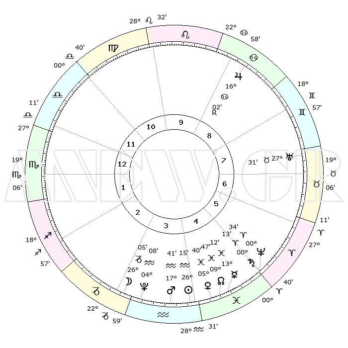 | | ΘΕΣΕΙΣ ΠΛΑΝΗΤΩΝ ΑΣΤΡΟΛΟΓΙΚΟΥ ΧΑΡΤΗ ΤΗΣ ΣΤΙΓΜΗΣ ΑΥΤΗΣ | | | | Πλανήτης | Ζώδιο | Μοίρες | Δεκαήμ. | Σε οίκο | Απόκλιση | | Ακμές των οίκων | | Ηλιος | Υδροχόος | 26°12' | Τρίτο | 4 | 12 S 47 | | 1ος | 02°48' | Σκορπιός | | Σελήνη | Αιγόκερως | 25°23' | Τρίτο | 3 | 24 S 38 | | 2ος | 01°23' | Τοξότης | | Ερμής | Ιχθείς | 13°07' | Δεύτερο | 5 | 06 S 36 | | 3ος | 03°34' | Αιγόκερως | | Αφροδίτη | Ιχθείς | 05°36' | Πρώτο | 4 | 10 S 49 | | 4ος | 07°57' | Υδροχόος | | Αρης | Υδροχόος | 17°39' | Δεύτερο | 4 | 16 S 34 | | 5ος | 10°50' | Ιχθείς | | Δίας | Καρκίνος | 16°02'R | Δεύτερο | 9 | 22 N 48 | | 6ος | 09°14' | Κριός | | Κρόνος | Κριός | 00°13' | Πρώτο | 5 | 01 S 53 | | 7ος | 02°48' | Ταύρος | | Ουρανός | Ταύρος | 27°31' | Τρίτο | 7 | 19 N 25 | | 8ος | 01°23' | Δίδυμοι | | Ποσειδώνας | Κριός | 00°34' | Πρώτο | 5 | 00 S 59 | | 9ος | 03°34' | Καρκίνος | | Πλούτωνας | Υδροχόος | 04°08' | Πρώτο | 3 | 22 S 57 | | 10ος | 07°57' | Λέων | | Β. Δεσμός | Ιχθείς | 09°48' | Πρώτο | 4 | 07 S 54 | | 11ος | 10°50' | Παρθένος | | Ωροσκόπος | Σκορπιός | 02°48' | Πρώτο | | | 12ος | 09°14' | Ζυγός | | Μεσουράνημα | Λέων | 07°57' | Πρώτο | | | |
