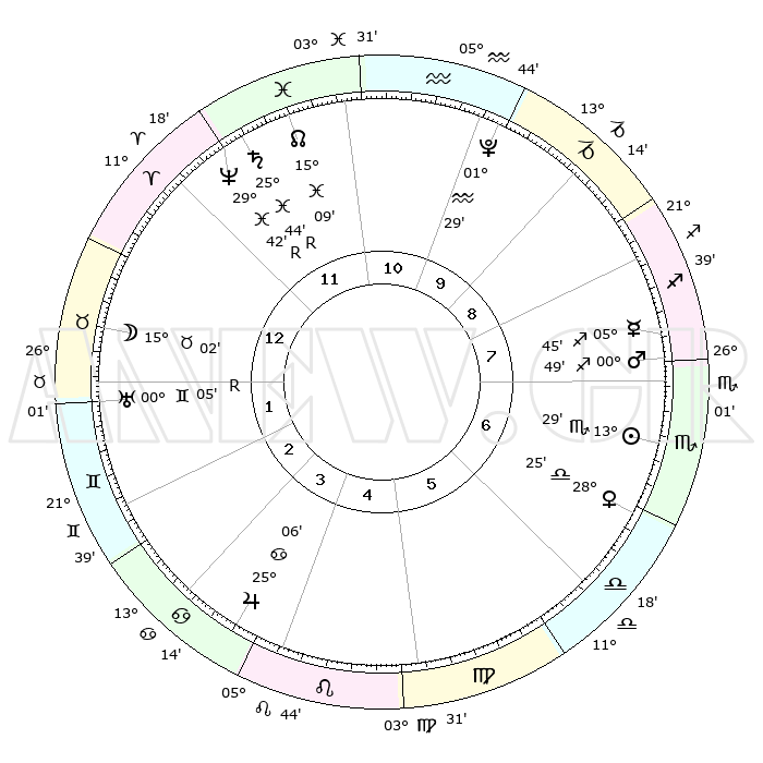 | | ΘΕΣΕΙΣ ΠΛΑΝΗΤΩΝ ΑΣΤΡΟΛΟΓΙΚΟΥ ΧΑΡΤΗ ΤΗΣ ΣΤΙΓΜΗΣ ΑΥΤΗΣ | | | | Πλανήτης | Ζώδιο | Μοίρες | Δεκαήμ. | Σε οίκο | Απόκλιση | | Ακμές των οίκων | | Ηλιος | Σκορπιός | 13°23' | Δεύτερο | 8 | 15 S 51 | | 1ος | 02°27' | Κριός | | Σελήνη | Ταύρος | 13°28' | Δεύτερο | 2 | 19 N 56 | | 2ος | 12°08' | Ταύρος | | Ερμής | Τοξότης | 05°42' | Πρώτο | 8 | 24 S 00 | | 3ος | 09°10' | Δίδυμοι | | Αφροδίτη | Ζυγός | 28°17' | Τρίτο | 7 | 09 S 33 | | 4ος | 01°22' | Καρκίνος | | Αρης | Τοξότης | 00°45' | Πρώτο | 8 | 20 S 44 | | 5ος | 23°47' | Καρκίνος | | Δίας | Καρκίνος | 25°05' | Τρίτο | 5 | 21 N 12 | | 6ος | 21°34' | Λέων | | Κρόνος | Ιχθείς | 25°44'R | Τρίτο | 12 | 03 S 57 | | 7ος | 02°27' | Ζυγός | | Ουρανός | Δίδυμοι | 00°06'R | Πρώτο | 2 | 19 N 58 | | 8ος | 12°08' | Σκορπιός | | Ποσειδώνας | Ιχθείς | 29°42'R | Τρίτο | 12 | 01 S 22 | | 9ος | 09°10' | Τοξότης | | Πλούτωνας | Υδροχόος | 01°29' | Πρώτο | 11 | 23 S 30 | | 10ος | 01°22' | Αιγόκερως | | Β. Δεσμός | Ιχθείς | 15°09' | Δεύτερο | 12 | 05 S 51 | | 11ος | 23°47' | Αιγόκερως | | Ωροσκόπος | Κριός | 02°27' | Πρώτο | | | 12ος | 21°34' | Υδροχόος | | Μεσουράνημα | Αιγόκερως | 01°22' | Πρώτο | | | |