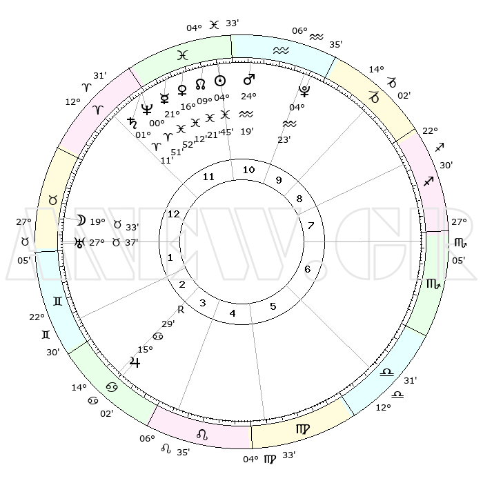 | | ΘΕΣΕΙΣ ΠΛΑΝΗΤΩΝ ΑΣΤΡΟΛΟΓΙΚΟΥ ΧΑΡΤΗ ΤΗΣ ΣΤΙΓΜΗΣ ΑΥΤΗΣ | | | | Πλανήτης | Ζώδιο | Μοίρες | Δεκαήμ. | Σε οίκο | Απόκλιση | | Ακμές των οίκων | | Ηλιος | Ιχθείς | 04°41' | Πρώτο | 11 | 09 S 47 | | 1ος | 25°49' | Κριός | | Σελήνη | Ταύρος | 18°39' | Δεύτερο | 1 | 22 N 08 | | 2ος | 29°12' | Ταύρος | | Ερμής | Ιχθείς | 21°51' | Τρίτο | 12 | 01 S 19 | | 3ος | 23°12' | Δίδυμοι | | Αφροδίτη | Ιχθείς | 16°07' | Δεύτερο | 12 | 06 S 47 | | 4ος | 14°53' | Καρκίνος | | Αρης | Υδροχόος | 24°16' | Τρίτο | 11 | 14 S 28 | | 5ος | 08°54' | Λέων | | Δίας | Καρκίνος | 15°30'R | Δεύτερο | 4 | 22 N 52 | | 6ος | 10°48' | Παρθένος | | Κρόνος | Κριός | 01°10' | Πρώτο | 12 | 01 S 30 | | 7ος | 25°49' | Ζυγός | | Ουρανός | Ταύρος | 27°37' | Τρίτο | 1 | 19 N 27 | | 8ος | 29°12' | Σκορπιός | | Ποσειδώνας | Κριός | 00°51' | Πρώτο | 12 | 00 S 52 | | 9ος | 23°12' | Τοξότης | | Πλούτωνας | Υδροχόος | 04°23' | Πρώτο | 10 | 22 S 54 | | 10ος | 14°53' | Αιγόκερως | | Β. Δεσμός | Ιχθείς | 09°21' | Πρώτο | 11 | 08 S 04 | | 11ος | 08°54' | Υδροχόος | | Ωροσκόπος | Κριός | 25°49' | Τρίτο | | | 12ος | 10°48' | Ιχθείς | | Μεσουράνημα | Αιγόκερως | 14°53' | Δεύτερο | | | |