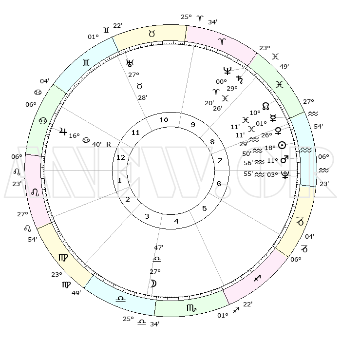 | | ΘΕΣΕΙΣ ΠΛΑΝΗΤΩΝ ΑΣΤΡΟΛΟΓΙΚΟΥ ΧΑΡΤΗ ΤΗΣ ΣΤΙΓΜΗΣ ΑΥΤΗΣ | | | | Πλανήτης | Ζώδιο | Μοίρες | Δεκαήμ. | Σε οίκο | Απόκλιση | | Ακμές των οίκων | | Ηλιος | Υδροχόος | 18°46' | Δεύτερο | 8 | 15 S 12 | | 1ος | 16°55' | Καρκίνος | | Σελήνη | Ζυγός | 26°58' | Τρίτο | 4 | 14 S 01 | | 2ος | 07°23' | Λέων | | Ερμής | Ιχθείς | 01°04' | Πρώτο | 9 | 12 S 16 | | 3ος | 00°45' | Παρθένος | | Αφροδίτη | Υδροχόος | 26°24' | Τρίτο | 8 | 14 S 04 | | 4ος | 29°52' | Παρθένος | | Αρης | Υδροχόος | 11°52' | Δεύτερο | 8 | 18 S 15 | | 5ος | 05°43' | Σκορπιός | | Δίας | Καρκίνος | 16°40'R | Δεύτερο | 12 | 22 N 42 | | 6ος | 13°37' | Τοξότης | | Κρόνος | Ιχθείς | 29°25' | Τρίτο | 9 | 02 S 13 | | 7ος | 16°55' | Αιγόκερως | | Ουρανός | Ταύρος | 27°28' | Τρίτο | 11 | 19 N 24 | | 8ος | 07°23' | Υδροχόος | | Ποσειδώνας | Κριός | 00°20' | Πρώτο | 10 | 01 S 04 | | 9ος | 00°45' | Ιχθείς | | Πλούτωνας | Υδροχόος | 03°54' | Πρώτο | 7 | 22 S 59 | | 10ος | 29°52' | Ιχθείς | | Β. Δεσμός | Ιχθείς | 10°11' | Δεύτερο | 9 | 07 S 45 | | 11ος | 05°43' | Ταύρος | | Ωροσκόπος | Καρκίνος | 16°55' | Δεύτερο | | | 12ος | 13°37' | Δίδυμοι | | Μεσουράνημα | Ιχθείς | 29°52' | Τρίτο | | | |