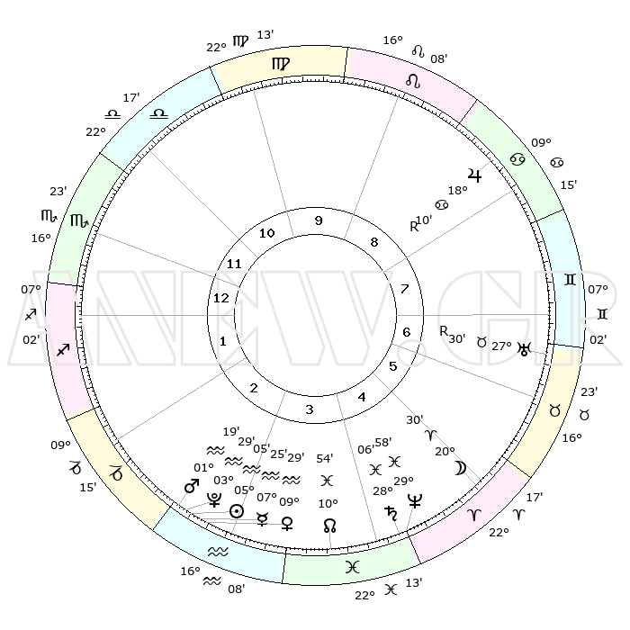 | | ΘΕΣΕΙΣ ΠΛΑΝΗΤΩΝ ΑΣΤΡΟΛΟΓΙΚΟΥ ΧΑΡΤΗ ΤΗΣ ΣΤΙΓΜΗΣ ΑΥΤΗΣ | | | | Πλανήτης | Ζώδιο | Μοίρες | Δεκαήμ. | Σε οίκο | Απόκλιση | | Ακμές των οίκων | | Ηλιος | Υδροχόος | 05°01' | Πρώτο | 3 | 19 S 00 | | 1ος | 16°22' | Σκορπιός | | Σελήνη | Κριός | 19°32' | Δεύτερο | 5 | 10 N 45 | | 2ος | 15°58' | Τοξότης | | Ερμής | Υδροχόος | 07°18' | Πρώτο | 3 | 20 S 28 | | 3ος | 19°37' | Αιγόκερως | | Αφροδίτη | Υδροχόος | 09°24' | Πρώτο | 3 | 19 S 05 | | 4ος | 24°60' | Υδροχόος | | Αρης | Υδροχόος | 01°16' | Πρώτο | 3 | 20 S 52 | | 5ος | 27°20' | Ιχθείς | | Δίας | Καρκίνος | 18°11'R | Δεύτερο | 8 | 22 N 29 | | 6ος | 24°12' | Κριός | | Κρόνος | Ιχθείς | 28°06' | Τρίτο | 5 | 02 S 46 | | 7ος | 16°22' | Ταύρος | | Ουρανός | Ταύρος | 27°30'R | Τρίτο | 7 | 19 N 25 | | 8ος | 15°58' | Δίδυμοι | | Ποσειδώνας | Ιχθείς | 29°58' | Τρίτο | 5 | 01 S 14 | | 9ος | 19°37' | Καρκίνος | | Πλούτωνας | Υδροχόος | 03°29' | Πρώτο | 3 | 23 S 04 | | 10ος | 24°60' | Λέων | | Β. Δεσμός | Ιχθείς | 10°54' | Δεύτερο | 4 | 07 S 29 | | 11ος | 27°20' | Παρθένος | | Ωροσκόπος | Σκορπιός | 16°22' | Δεύτερο | | | 12ος | 24°12' | Ζυγός | | Μεσουράνημα | Λέων | 24°60' | Τρίτο | | | |