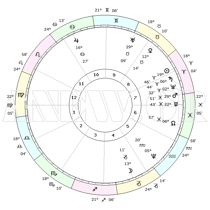 | | ΘΕΣΕΙΣ ΠΛΑΝΗΤΩΝ ΑΣΤΡΟΛΟΓΙΚΟΥ ΧΑΡΤΗ ΤΗΣ ΣΤΙΓΜΗΣ ΑΥΤΗΣ | | | | Πλανήτης | Ζώδιο | Μοίρες | Δεκαήμ. | Σε οίκο | Απόκλιση | | Ακμές των οίκων | | Ηλιος | Κριός | 19°38' | Δεύτερο | 9 | 07 N 41 | | 1ος | 11°60' | Λέων | | Σελήνη | Αιγόκερως | 11°32' | Δεύτερο | 5 | 27 S 14 | | 2ος | 04°00' | Παρθένος | | Ερμής | Ιχθείς | 22°33' | Τρίτο | 8 | 05 S 04 | | 3ος | 00°40' | Ζυγός | | Αφροδίτη | Ταύρος | 12°03' | Δεύτερο | 10 | 15 N 23 | | 4ος | 02°53' | Σκορπιός | | Αρης | Ιχθείς | 29°44' | Τρίτο | 8 | 01 S 02 | | 5ος | 08°22' | Τοξότης | | Δίας | Καρκίνος | 16°26' | Δεύτερο | 12 | 22 N 48 | | 6ος | 12°15' | Αιγόκερως | | Κρόνος | Κριός | 06°43' | Πρώτο | 9 | 00 N 42 | | 7ος | 11°60' | Υδροχόος | | Ουρανός | Ταύρος | 29°09' | Τρίτο | 10 | 19 N 48 | | 8ος | 04°00' | Ιχθείς | | Ποσειδώνας | Κριός | 02°31' | Πρώτο | 9 | 00 S 12 | | 9ος | 00°40' | Κριός | | Πλούτωνας | Υδροχόος | 05°20' | Πρώτο | 6 | 22 S 47 | | 10ος | 02°53' | Ταύρος | | Β. Δεσμός | Ιχθείς | 06°57' | Πρώτο | 8 | 08 S 57 | | 11ος | 08°22' | Δίδυμοι | | Ωροσκόπος | Λέων | 11°60' | Δεύτερο | | | 12ος | 12°15' | Καρκίνος | | Μεσουράνημα | Ταύρος | 02°53' | Πρώτο | | | |