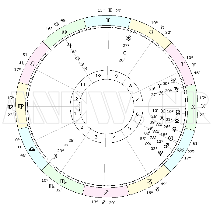 | | ΘΕΣΕΙΣ ΠΛΑΝΗΤΩΝ ΑΣΤΡΟΛΟΓΙΚΟΥ ΧΑΡΤΗ ΤΗΣ ΣΤΙΓΜΗΣ ΑΥΤΗΣ | | | | Πλανήτης | Ζώδιο | Μοίρες | Δεκαήμ. | Σε οίκο | Απόκλιση | | Ακμές των οίκων | | Ηλιος | Υδροχόος | 18°55' | Δεύτερο | 6 | 15 S 09 | | 1ος | 26°30' | Λέων | | Σελήνη | Ζυγός | 28°38' | Τρίτο | 3 | 14 S 43 | | 2ος | 19°60' | Παρθένος | | Ερμής | Ιχθείς | 01°18' | Πρώτο | 7 | 12 S 10 | | 3ος | 18°20' | Ζυγός | | Αφροδίτη | Υδροχόος | 26°34' | Τρίτο | 7 | 14 S 00 | | 4ος | 21°12' | Σκορπιός | | Αρης | Υδροχόος | 11°59' | Δεύτερο | 6 | 18 S 13 | | 5ος | 25°38' | Τοξότης | | Δίας | Καρκίνος | 16°40'R | Δεύτερο | 11 | 22 N 42 | | 6ος | 27°53' | Αιγόκερως | | Κρόνος | Ιχθείς | 29°26' | Τρίτο | 8 | 02 S 12 | | 7ος | 26°30' | Υδροχόος | | Ουρανός | Ταύρος | 27°28' | Τρίτο | 10 | 19 N 24 | | 8ος | 19°60' | Ιχθείς | | Ποσειδώνας | Κριός | 00°20' | Πρώτο | 8 | 01 S 04 | | 9ος | 18°20' | Κριός | | Πλούτωνας | Υδροχόος | 03°55' | Πρώτο | 6 | 22 S 59 | | 10ος | 21°12' | Ταύρος | | Β. Δεσμός | Ιχθείς | 10°10' | Δεύτερο | 7 | 07 S 45 | | 11ος | 25°38' | Δίδυμοι | | Ωροσκόπος | Λέων | 26°30' | Τρίτο | | | 12ος | 27°53' | Καρκίνος | | Μεσουράνημα | Ταύρος | 21°12' | Τρίτο | | | |