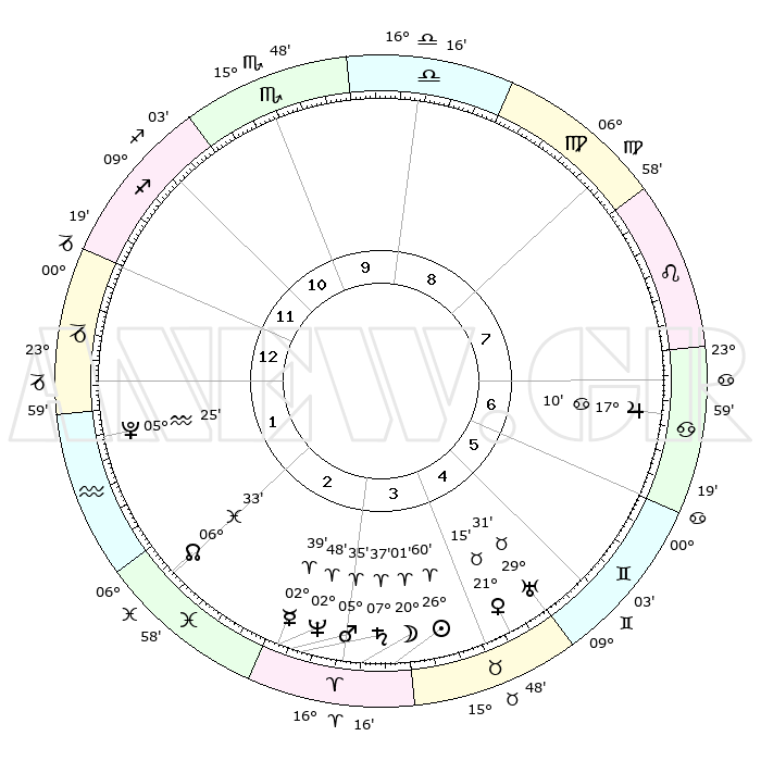 | | ΘΕΣΕΙΣ ΠΛΑΝΗΤΩΝ ΑΣΤΡΟΛΟΓΙΚΟΥ ΧΑΡΤΗ ΤΗΣ ΣΤΙΓΜΗΣ ΑΥΤΗΣ | | | | Πλανήτης | Ζώδιο | Μοίρες | Δεκαήμ. | Σε οίκο | Απόκλιση | | Ακμές των οίκων | | Ηλιος | Κριός | 26°55' | Τρίτο | 4 | 10 N 22 | | 1ος | 27°45' | Τοξότης | | Σελήνη | Κριός | 18°58' | Δεύτερο | 4 | 10 N 32 | | 2ος | 04°20' | Υδροχόος | | Ερμής | Κριός | 02°33' | Πρώτο | 3 | 01 S 24 | | 3ος | 14°09' | Ιχθείς | | Αφροδίτη | Ταύρος | 21°10' | Τρίτο | 5 | 18 N 18 | | 4ος | 18°27' | Κριός | | Αρης | Κριός | 05°31' | Πρώτο | 3 | 01 N 18 | | 5ος | 15°07' | Ταύρος | | Δίας | Καρκίνος | 17°10' | Δεύτερο | 7 | 22 N 43 | | 6ος | 07°05' | Δίδυμοι | | Κρόνος | Κριός | 07°37' | Πρώτο | 3 | 01 N 03 | | 7ος | 27°45' | Δίδυμοι | | Ουρανός | Ταύρος | 29°31' | Τρίτο | 5 | 19 N 53 | | 8ος | 04°20' | Λέων | | Ποσειδώνας | Κριός | 02°47' | Πρώτο | 3 | 00 S 06 | | 9ος | 14°09' | Παρθένος | | Πλούτωνας | Υδροχόος | 05°25' | Πρώτο | 2 | 22 S 47 | | 10ος | 18°27' | Ζυγός | | Β. Δεσμός | Ιχθείς | 06°34' | Πρώτο | 2 | 09 S 06 | | 11ος | 15°07' | Σκορπιός | | Ωροσκόπος | Τοξότης | 27°45' | Τρίτο | | | 12ος | 07°05' | Τοξότης | | Μεσουράνημα | Ζυγός | 18°27' | Δεύτερο | | | |