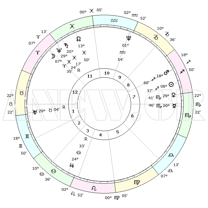 | | ΘΕΣΕΙΣ ΠΛΑΝΗΤΩΝ ΑΣΤΡΟΛΟΓΙΚΟΥ ΧΑΡΤΗ ΤΗΣ ΣΤΙΓΜΗΣ ΑΥΤΗΣ | | | | Πλανήτης | Ζώδιο | Μοίρες | Δεκαήμ. | Σε οίκο | Απόκλιση | | Ακμές των οίκων | | Ηλιος | Τοξότης | 08°35' | Πρώτο | 8 | 21 S 44 | | 1ος | 01°24' | Ταύρος | | Σελήνη | Κριός | 06°59' | Πρώτο | 12 | 04 N 33 | | 2ος | 03°14' | Δίδυμοι | | Ερμής | Σκορπιός | 20°46' | Τρίτο | 7 | 15 S 27 | | 3ος | 26°39' | Δίδυμοι | | Αφροδίτη | Σκορπιός | 29°38' | Τρίτο | 7 | 19 S 22 | | 4ος | 18°21' | Καρκίνος | | Αρης | Τοξότης | 18°58' | Δεύτερο | 8 | 23 S 38 | | 5ος | 12°53' | Λέων | | Δίας | Καρκίνος | 24°34'R | Τρίτο | 4 | 21 N 22 | | 6ος | 15°53' | Παρθένος | | Κρόνος | Ιχθείς | 25°17' | Τρίτο | 12 | 04 S 03 | | 7ος | 01°24' | Σκορπιός | | Ουρανός | Ταύρος | 29°04'R | Τρίτο | 1 | 19 N 45 | | 8ος | 03°14' | Τοξότης | | Ποσειδώνας | Ιχθείς | 29°24'R | Τρίτο | 12 | 01 S 29 | | 9ος | 26°39' | Τοξότης | | Πλούτωνας | Υδροχόος | 01°54' | Πρώτο | 10 | 23 S 24 | | 10ος | 18°21' | Αιγόκερως | | Β. Δεσμός | Ιχθείς | 13°50' | Δεύτερο | 11 | 06 S 21 | | 11ος | 12°53' | Υδροχόος | | Ωροσκόπος | Ταύρος | 01°24' | Πρώτο | | | 12ος | 15°53' | Ιχθείς | | Μεσουράνημα | Αιγόκερως | 18°21' | Δεύτερο | | | |