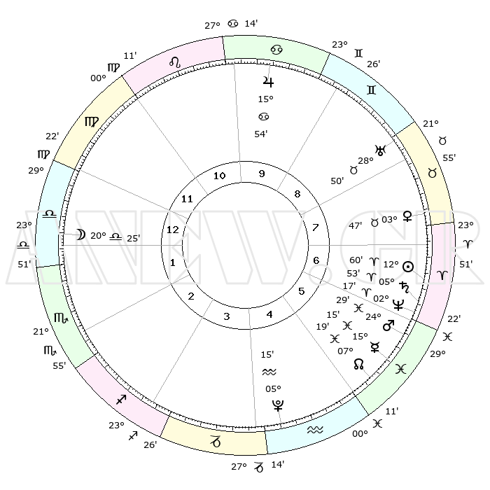 | | ΘΕΣΕΙΣ ΠΛΑΝΗΤΩΝ ΑΣΤΡΟΛΟΓΙΚΟΥ ΧΑΡΤΗ ΤΗΣ ΣΤΙΓΜΗΣ ΑΥΤΗΣ | | | | Πλανήτης | Ζώδιο | Μοίρες | Δεκαήμ. | Σε οίκο | Απόκλιση | | Ακμές των οίκων | | Ηλιος | Κριός | 12°57' | Δεύτερο | 7 | 05 N 07 | | 1ος | 09°11' | Ζυγός | | Σελήνη | Ζυγός | 19°48' | Δεύτερο | 1 | 10 S 54 | | 2ος | 06°23' | Σκορπιός | | Ερμής | Ιχθείς | 15°12' | Δεύτερο | 6 | 07 S 16 | | 3ος | 07°10' | Τοξότης | | Αφροδίτη | Ταύρος | 03°43' | Πρώτο | 7 | 12 N 24 | | 4ος | 10°20' | Αιγόκερως | | Αρης | Ιχθείς | 24°27' | Τρίτο | 6 | 03 S 10 | | 5ος | 13°16' | Υδροχόος | | Δίας | Καρκίνος | 15°54' | Δεύτερο | 10 | 22 N 51 | | 6ος | 13°19' | Ιχθείς | | Κρόνος | Κριός | 05°52' | Πρώτο | 6 | 00 N 22 | | 7ος | 09°11' | Κριός | | Ουρανός | Ταύρος | 28°50' | Τρίτο | 8 | 19 N 44 | | 8ος | 06°23' | Ταύρος | | Ποσειδώνας | Κριός | 02°16' | Πρώτο | 6 | 00 S 18 | | 9ος | 07°10' | Δίδυμοι | | Πλούτωνας | Υδροχόος | 05°15' | Πρώτο | 4 | 22 S 47 | | 10ος | 10°20' | Καρκίνος | | Β. Δεσμός | Ιχθείς | 07°19' | Πρώτο | 5 | 08 S 49 | | 11ος | 13°16' | Λέων | | Ωροσκόπος | Ζυγός | 09°11' | Πρώτο | | | 12ος | 13°19' | Παρθένος | | Μεσουράνημα | Καρκίνος | 10°20' | Δεύτερο | | | |